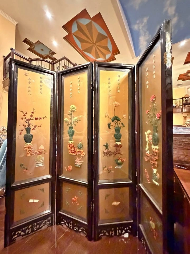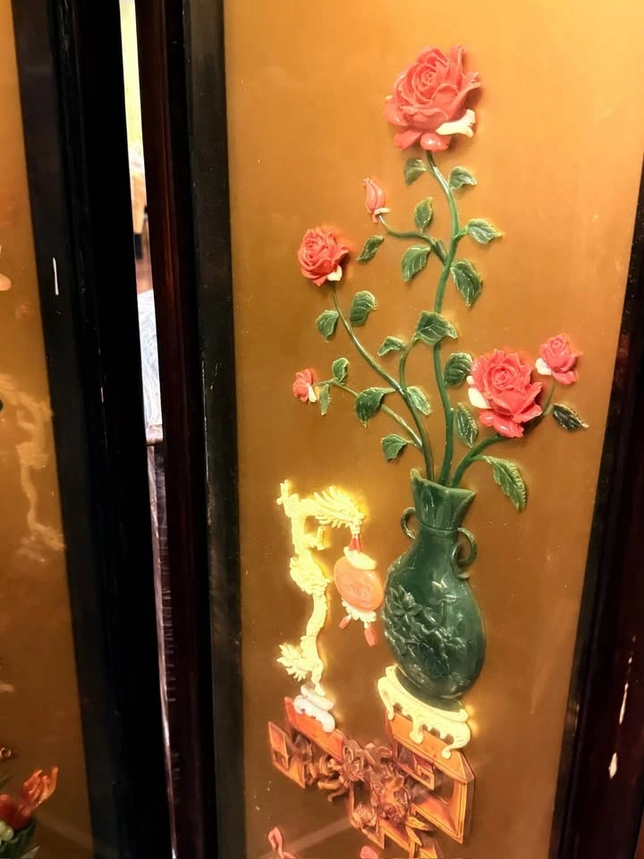 Black lacquer folding screen with four panels featuring raised floral still-life motifs, calligraphy, and symbolic objects on a warm amber background. Decorative and sculptural, with light age-appropriate wear; an eye-catching statement piece for room division or wall display.