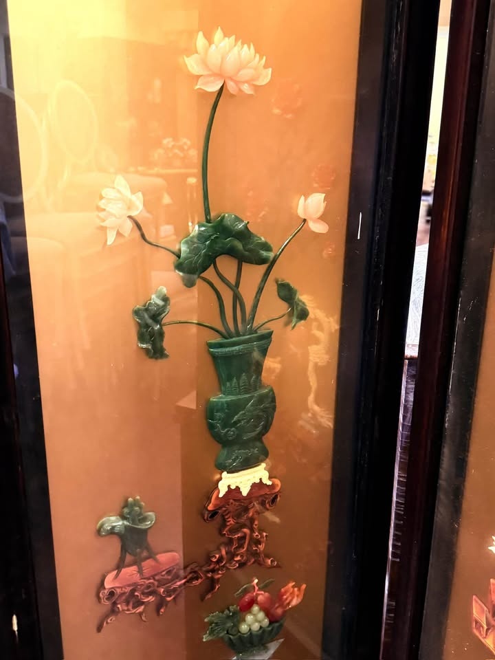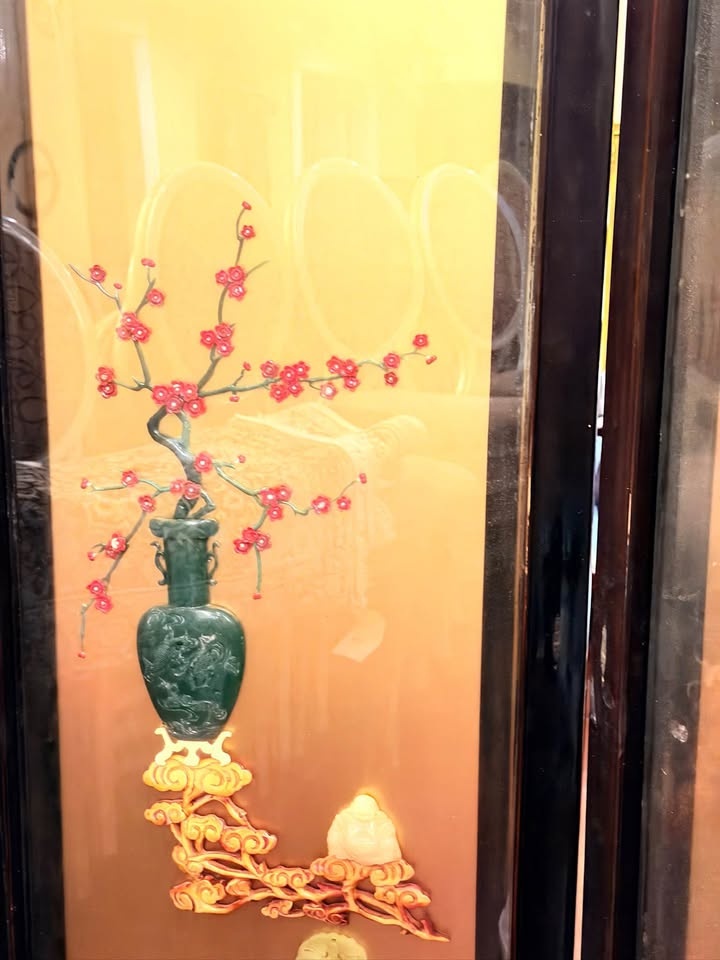 Black lacquer folding screen with four panels featuring raised floral still-life motifs, calligraphy, and symbolic objects on a warm amber background. Decorative and sculptural, with light age-appropriate wear; an eye-catching statement piece for room division or wall display.