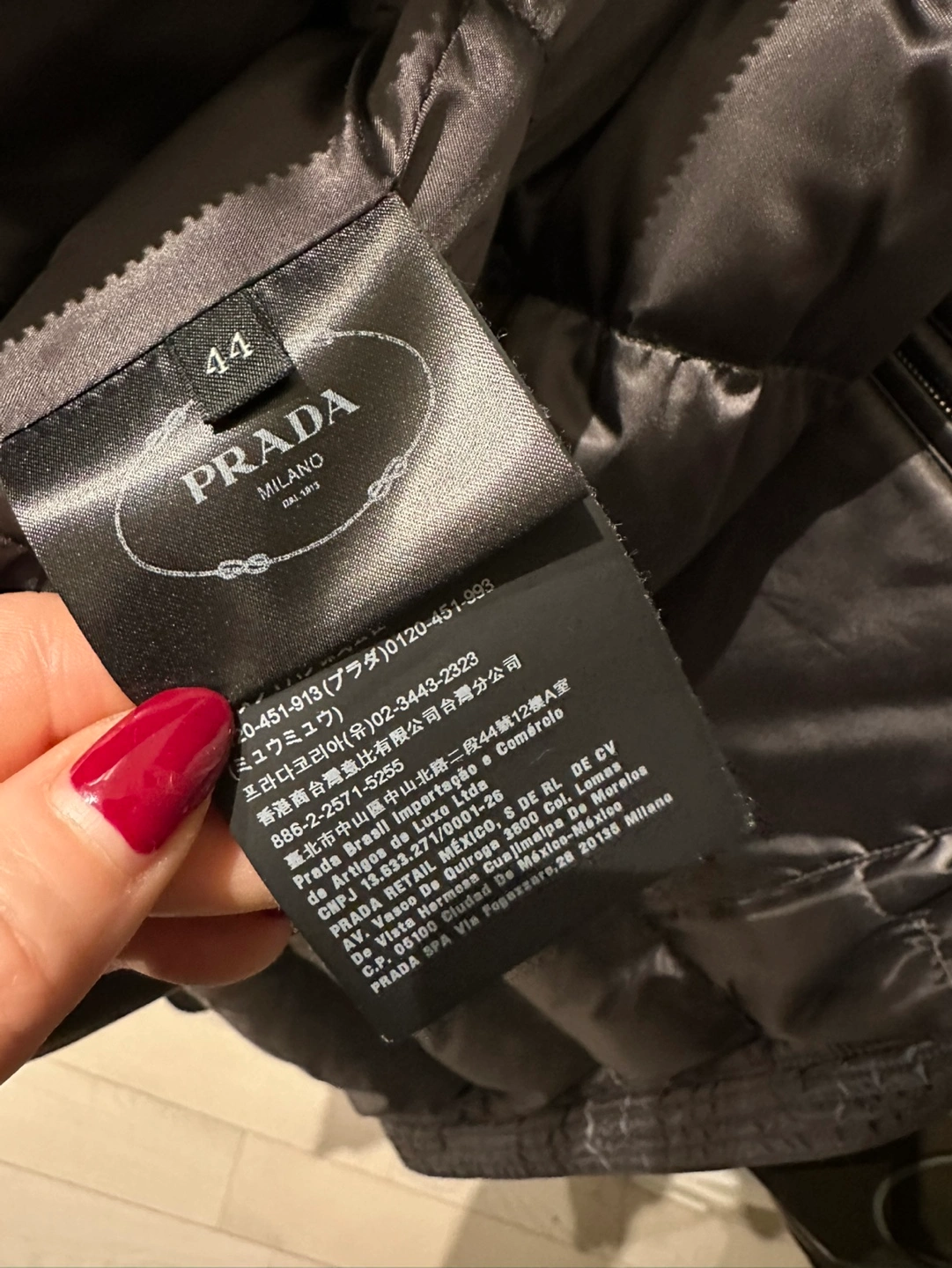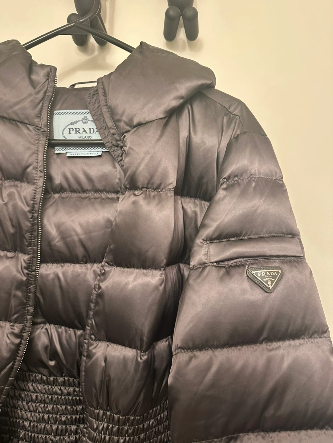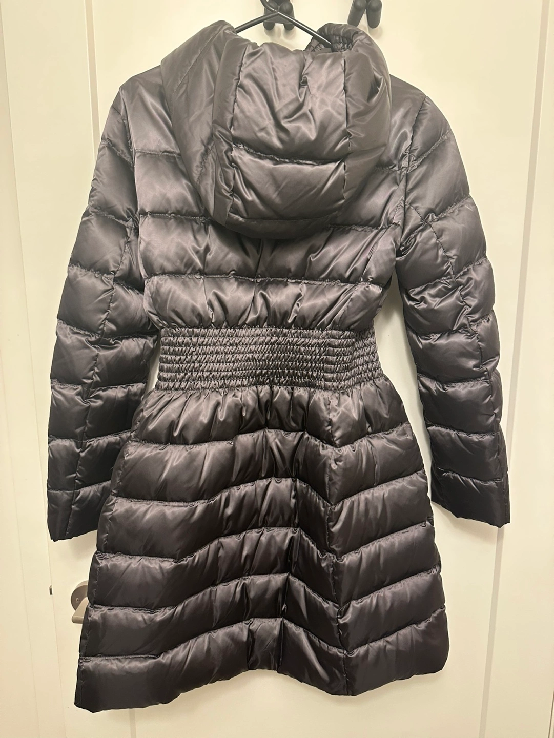 Black puffer jacket with a cinched waist and a hood. The jacket has a zipper closure and two pockets. Bought it for over $1100 at Prada outlet.