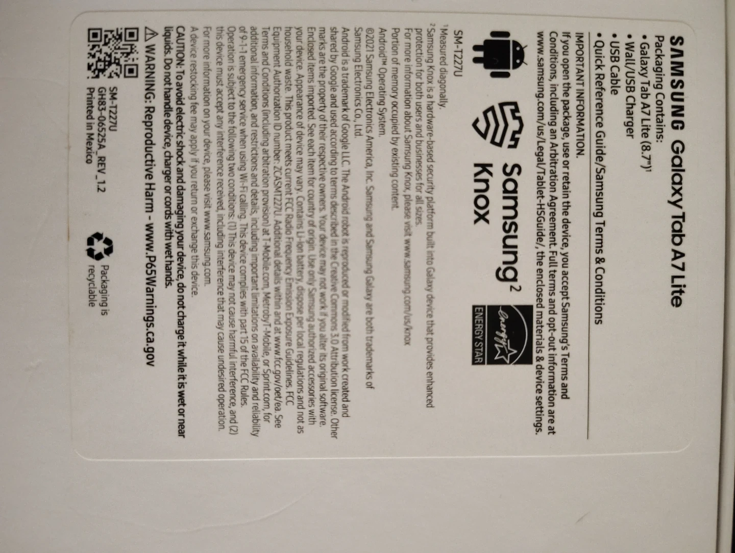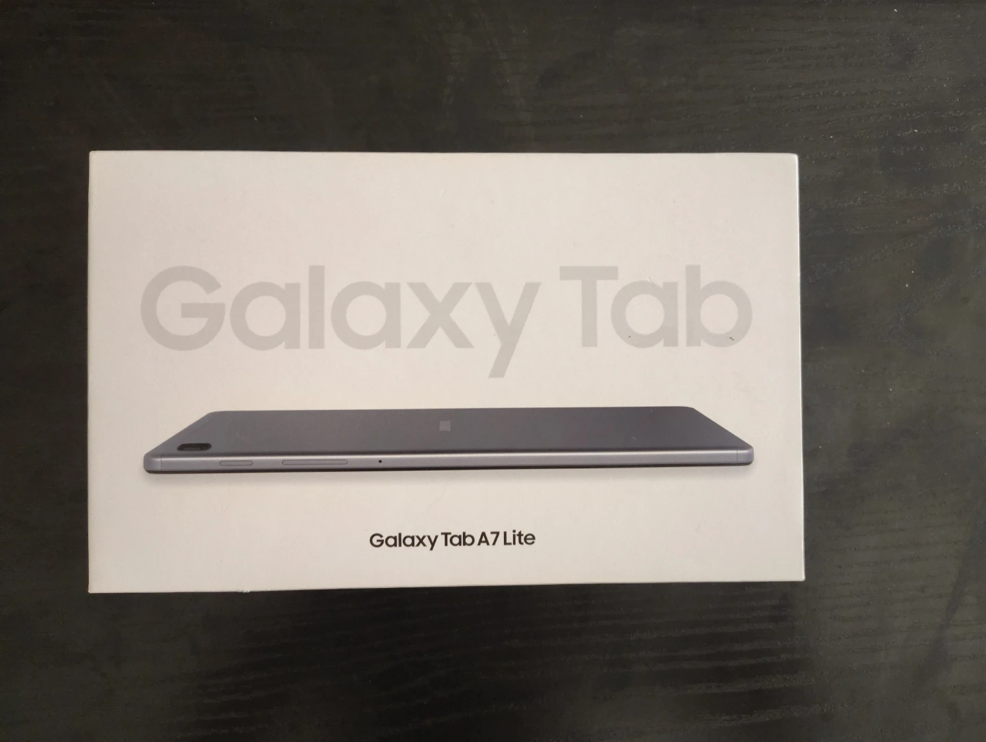 Samsung Galaxy Tab A7 Lite. Includes tablet, wall/USB charger, and USB cable. This device runs on Knox security.