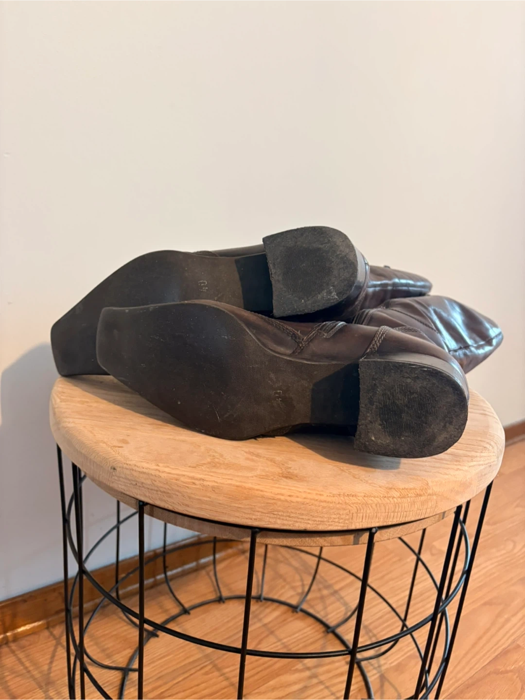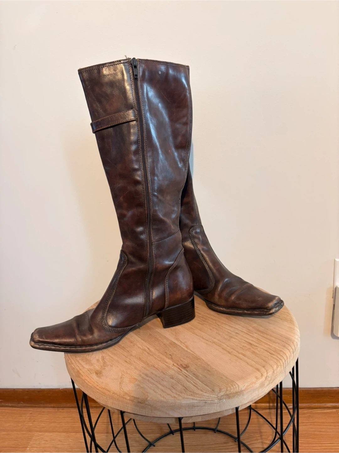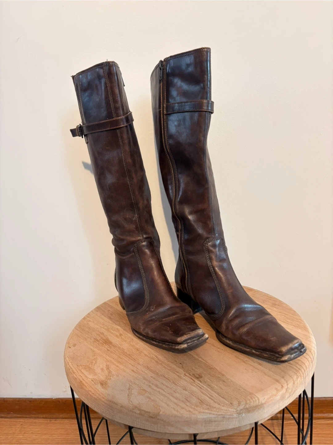 Really cool and sophisticated brown leather knee-high boots. They have a side zipper and buckle detail. Material is leather.
