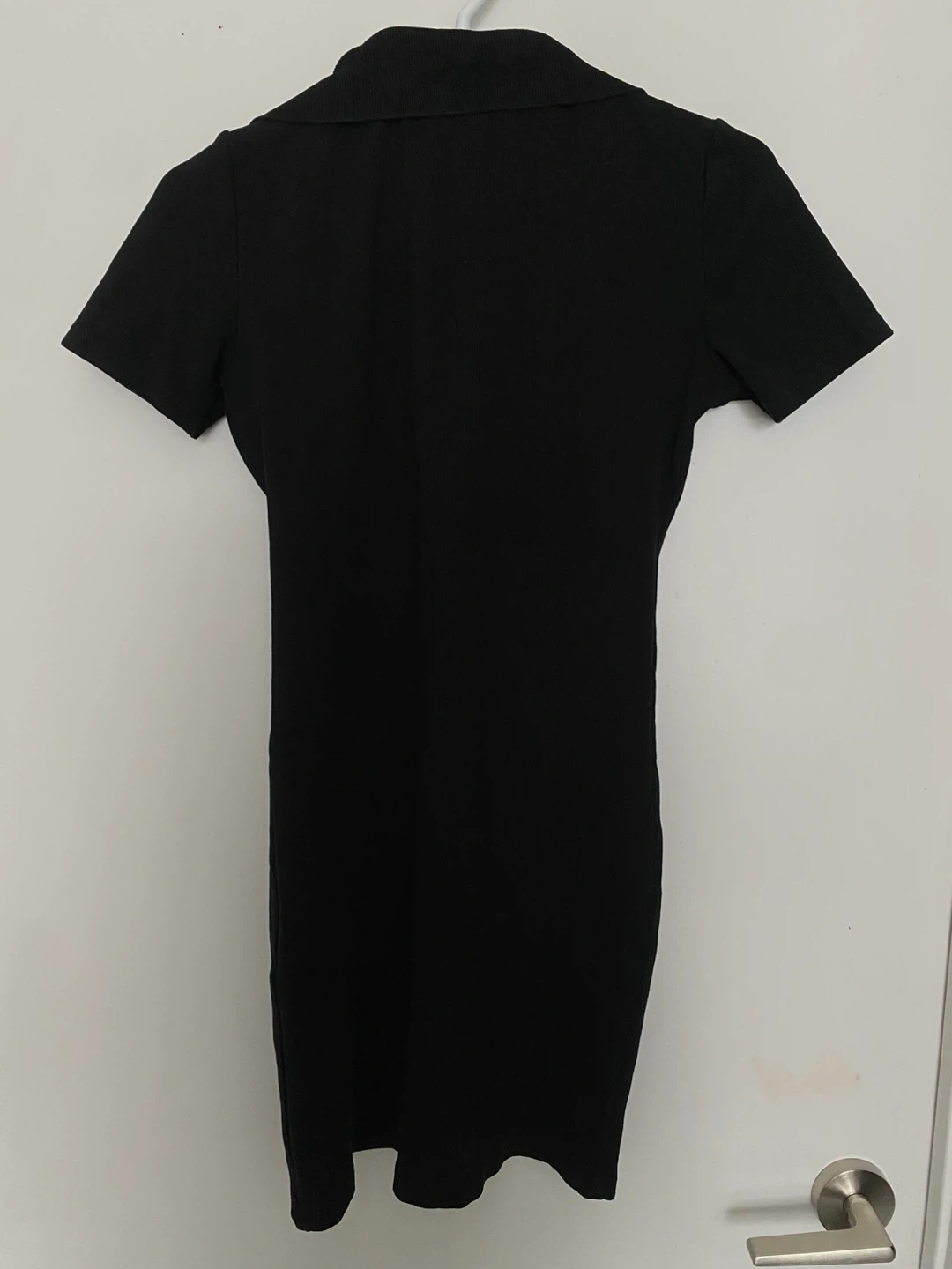 This is a black collared mini dress. It's a short-sleeve, form-fitting style. Ribbed material.