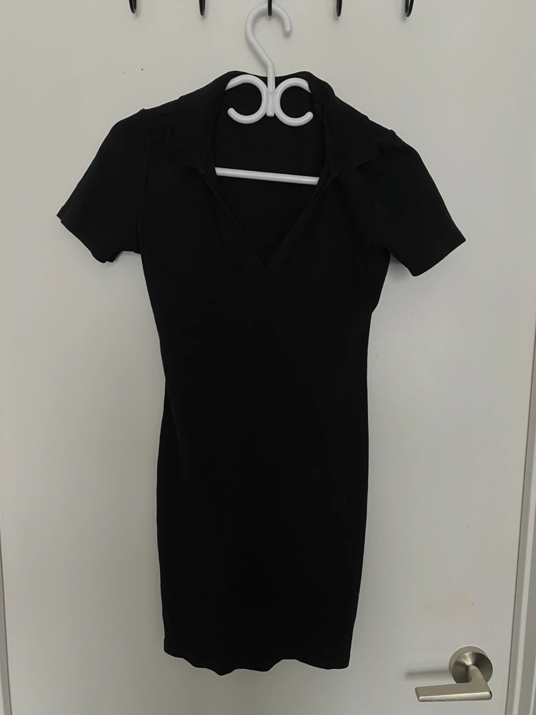 This is a black collared mini dress. It's a short-sleeve, form-fitting style. Ribbed material.