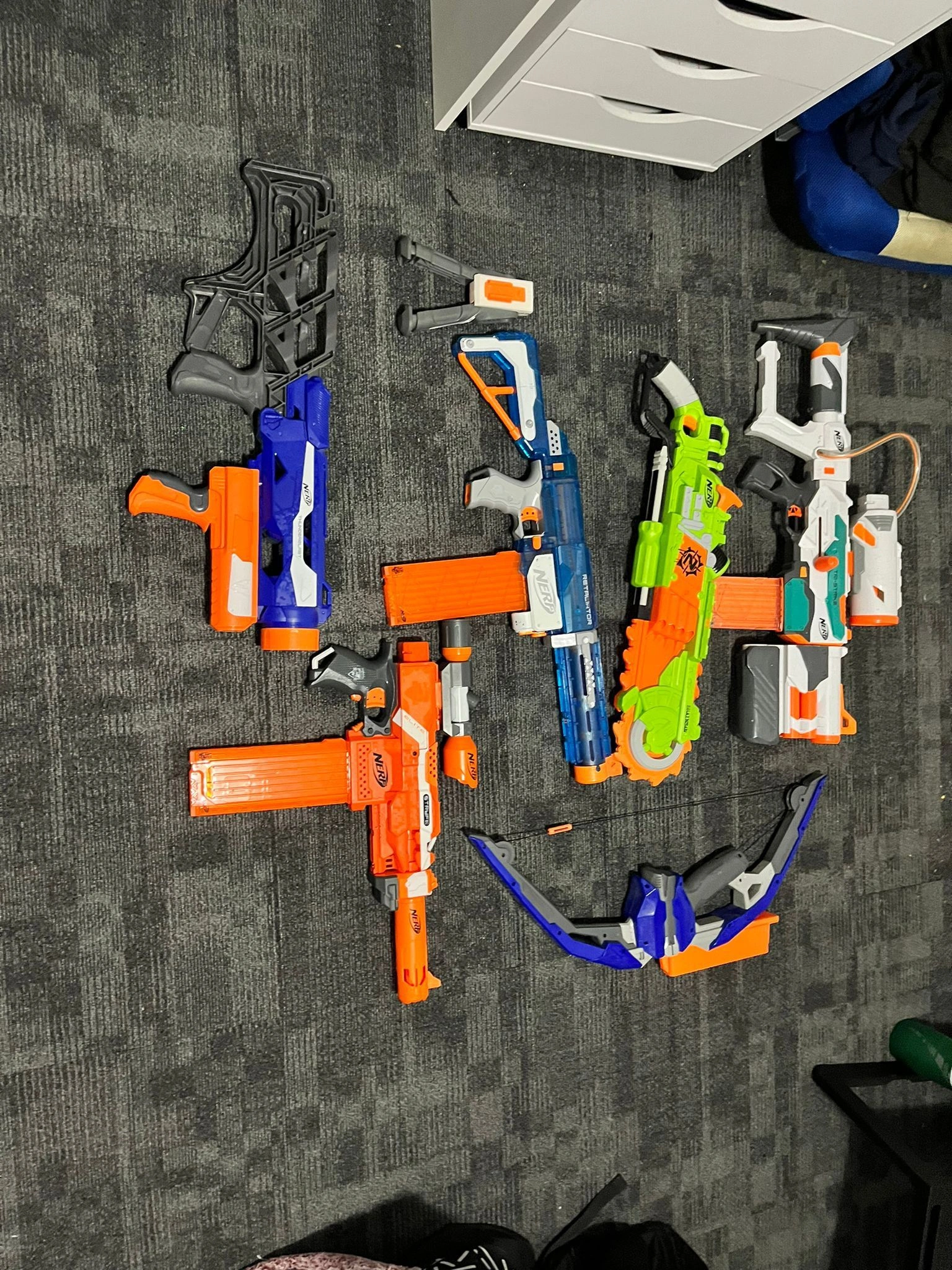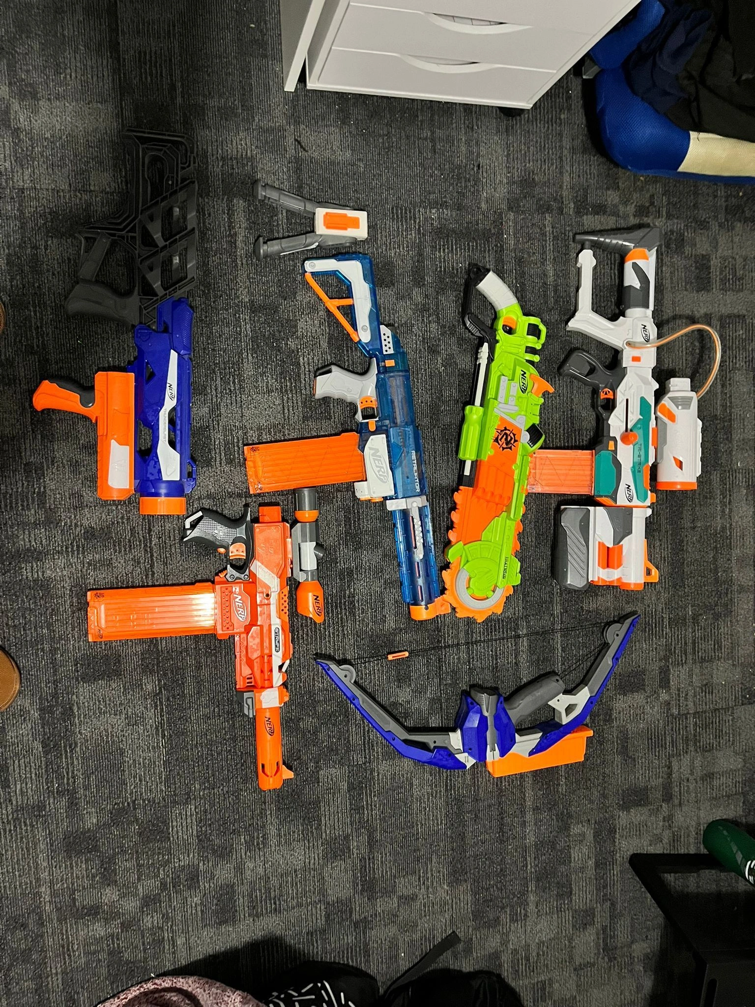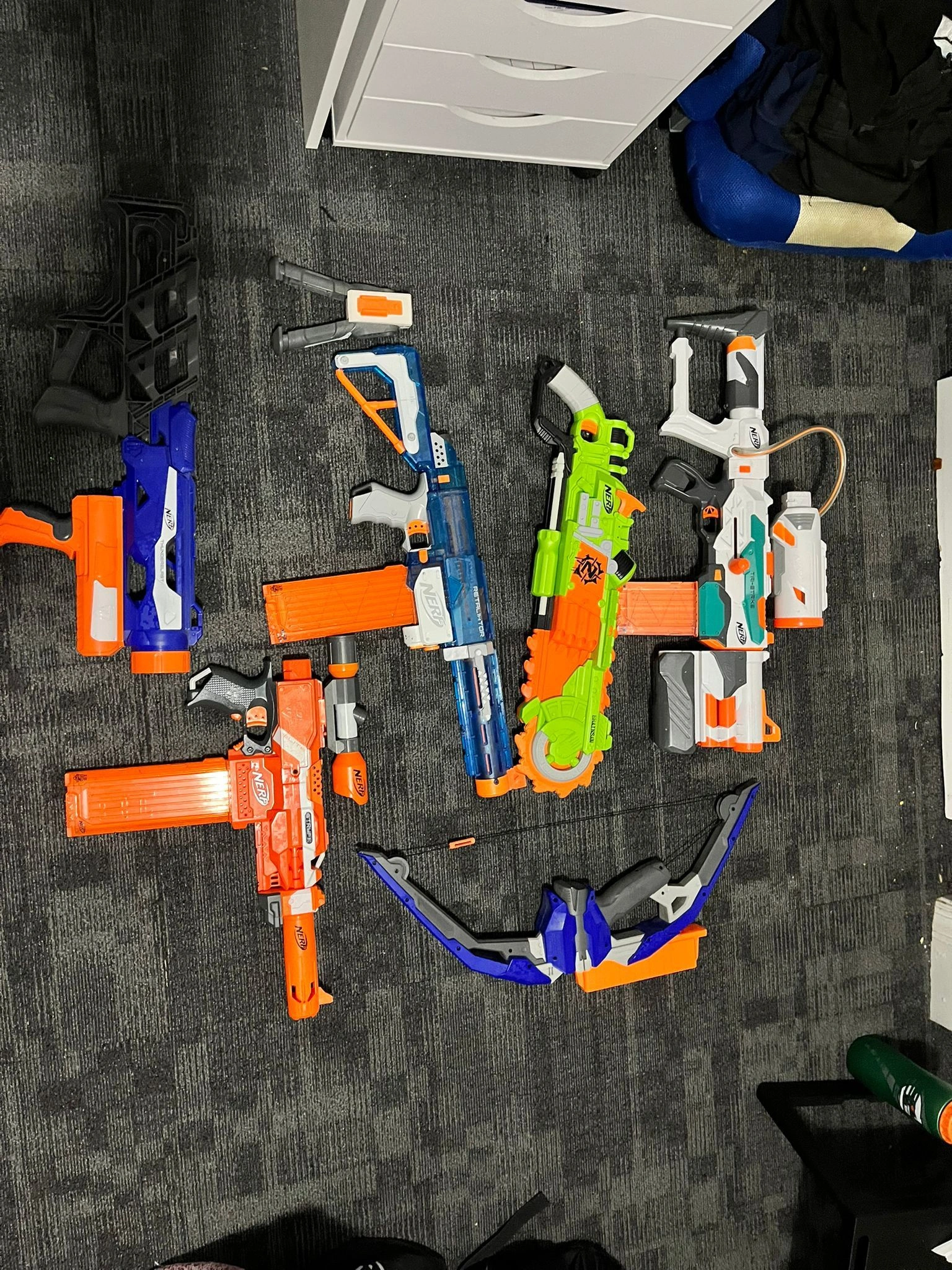 Includes: one Elite Retaliator, one Thunderblast, one Tri-Strike, one Brainsaw, one Elite Stryfe with attachments, and one Stratobow. All are Nerf brand.