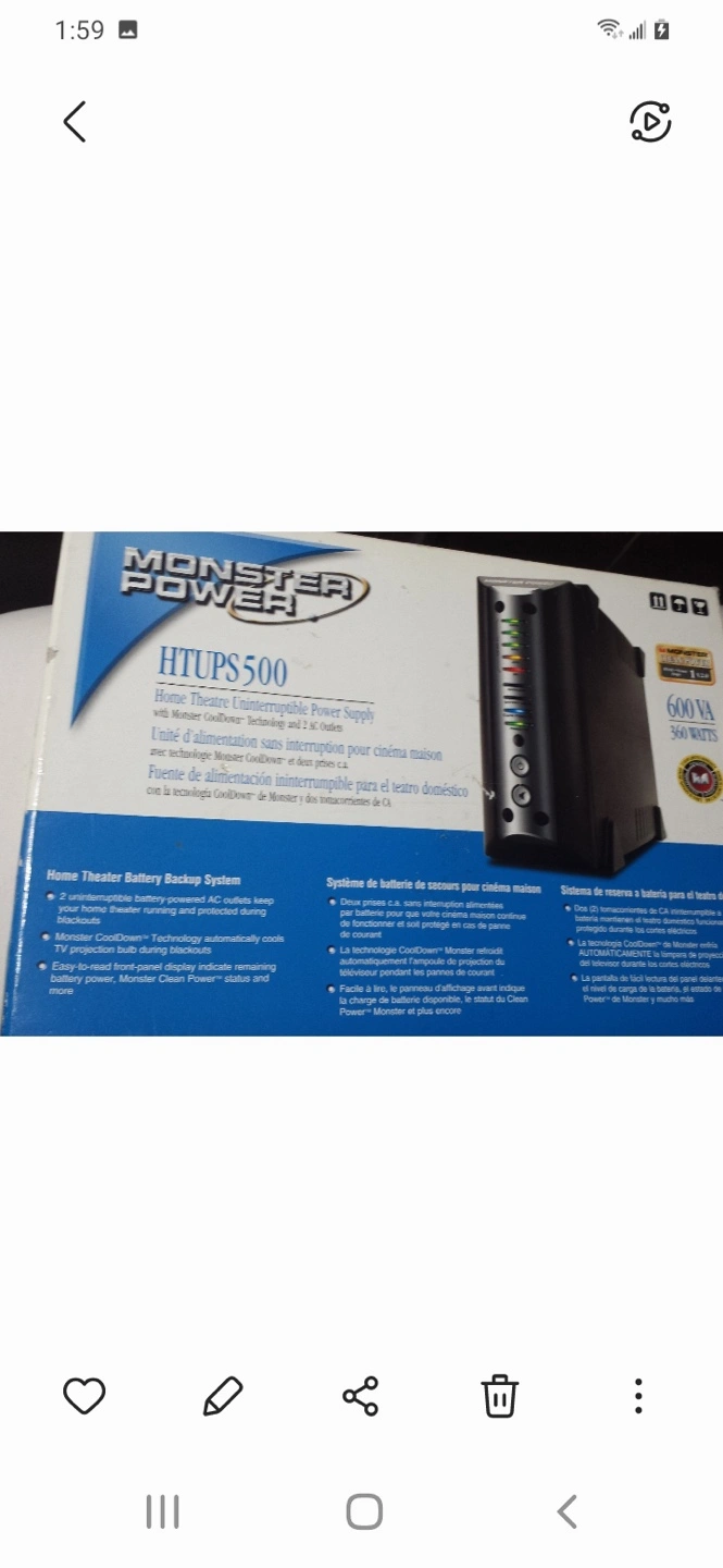 Home theatre uninterruptible power supply. Features Monster CoolDown technology and 2 AC outlets. Provides battery backup during blackouts. Easy-to-read display shows remaining battery power and more.