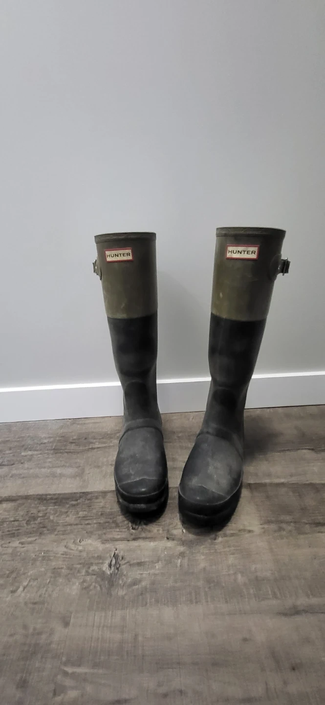 Hunter Original Colour Block tall rain boots. They feature a two-tone colour design. Great for rainy days, hunting/fishing, or farm work.