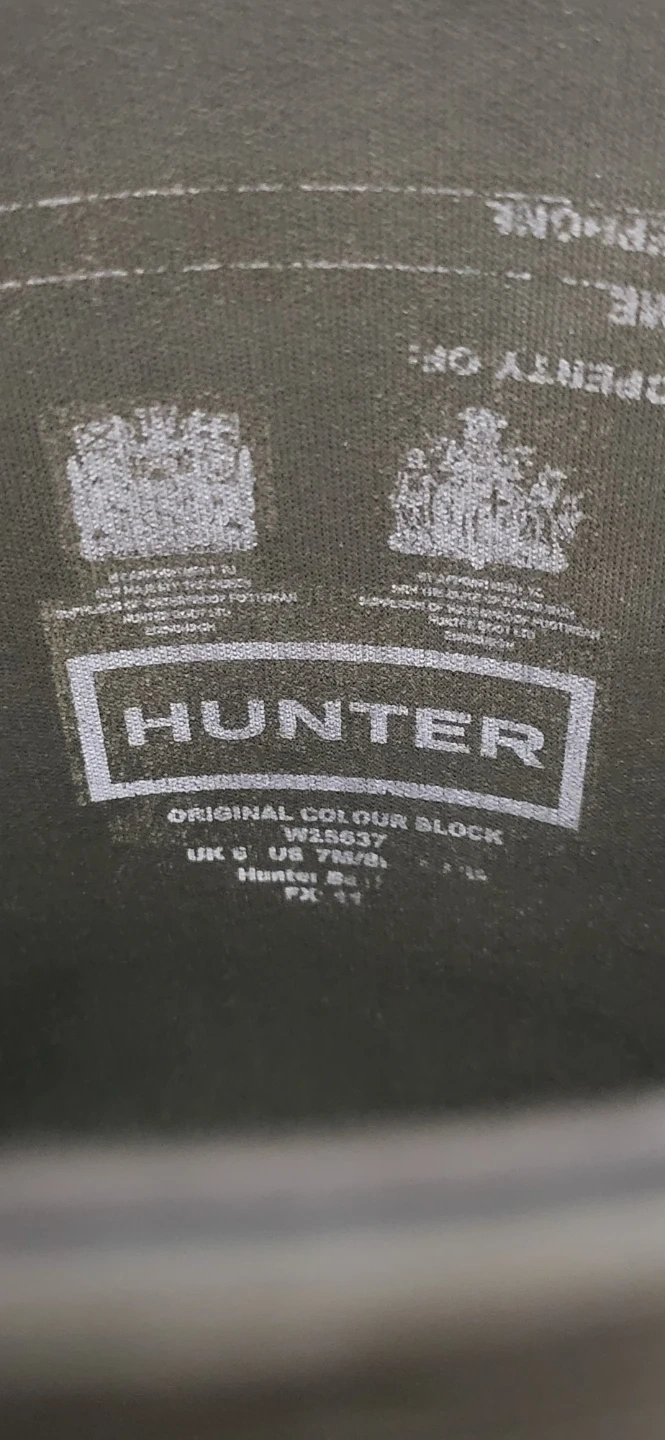 Hunter Original Colour Block tall rain boots. They feature a two-tone colour design. Great for rainy days, hunting/fishing, or farm work.
