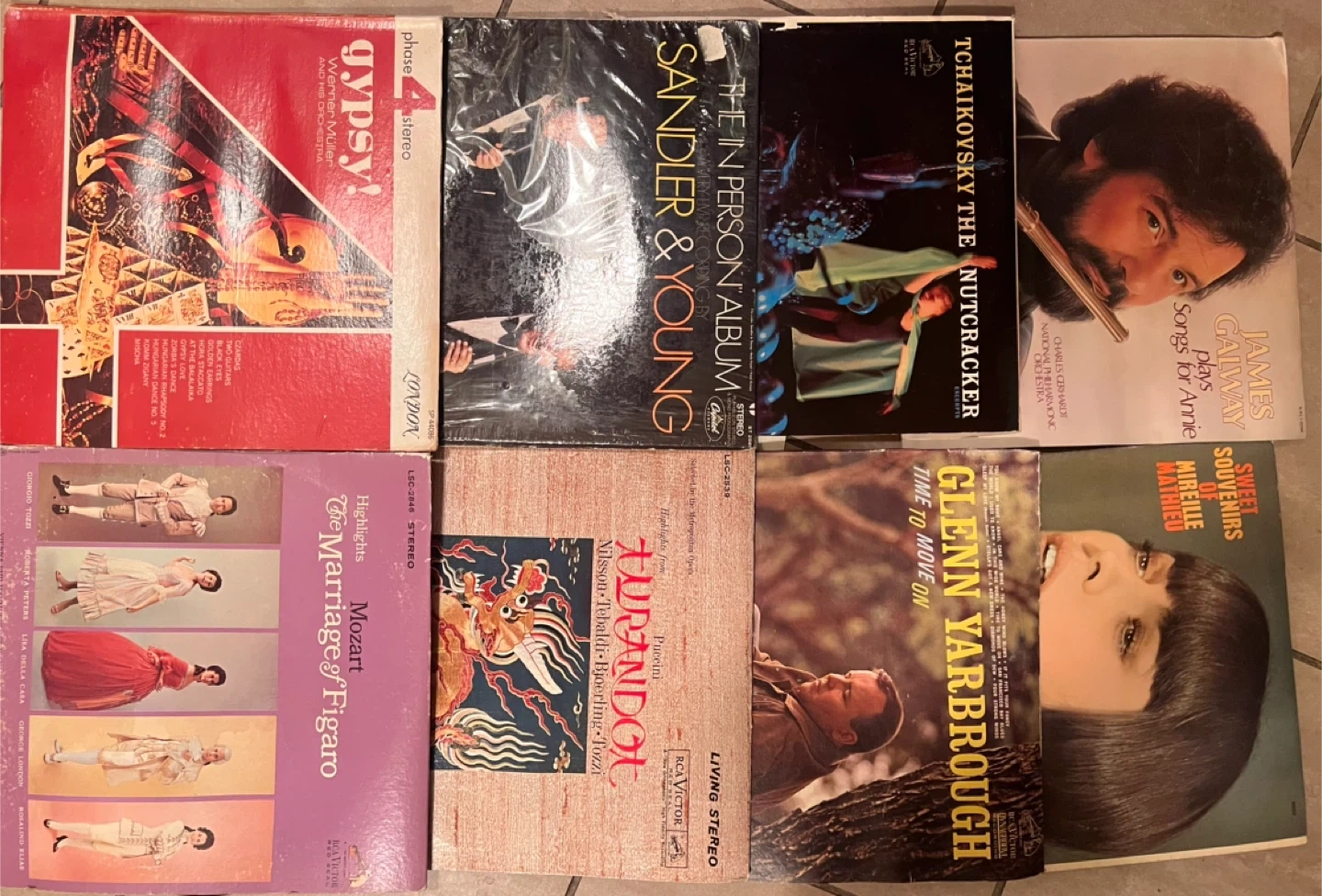 Gifting a collection of vintage vinyl records! Includes classical pieces like Tchaikovsky's The Nutcracker and Mozart's The Marriage of Figaro, as well as pop albums from artists like Sandler & Young, Glenn Yarbrough, James Galway and Mireille Mathieu. Perfect for collectors or anyone looking to add some classic tunes to their collection