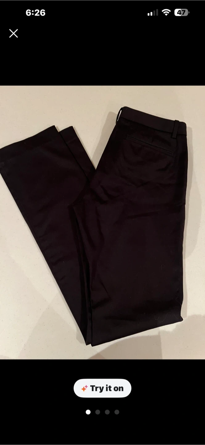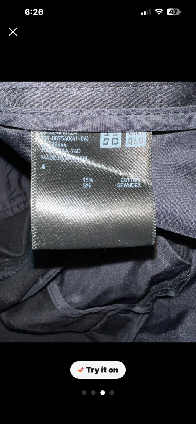 Selling a pair of black pants from Uniqlo in size 4. They're made of 95% cotton and 5% spandex. Perfect for everyday wear!