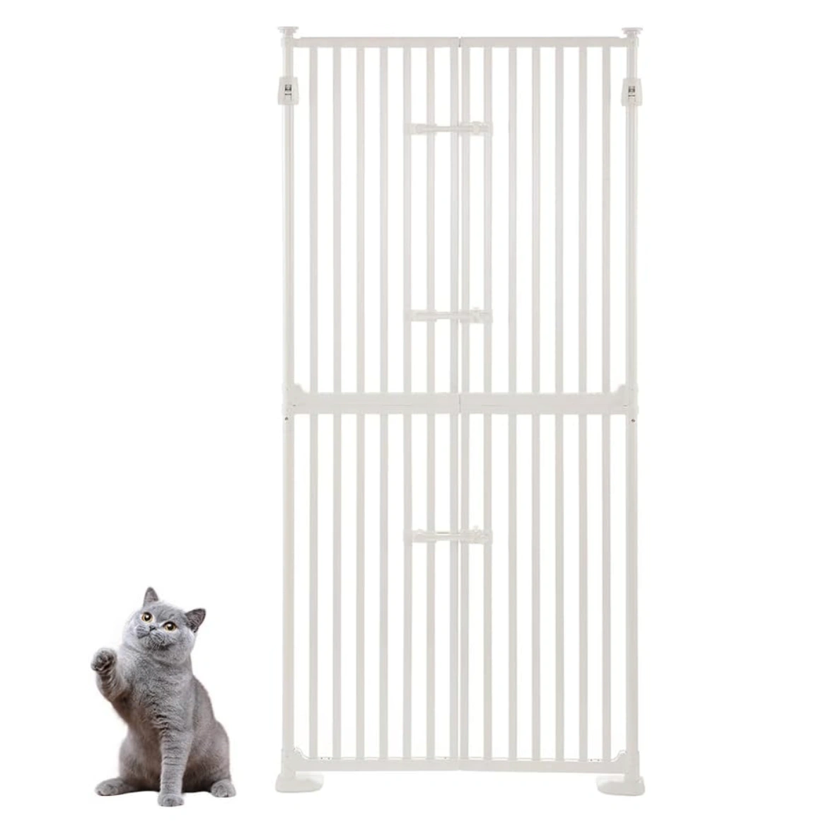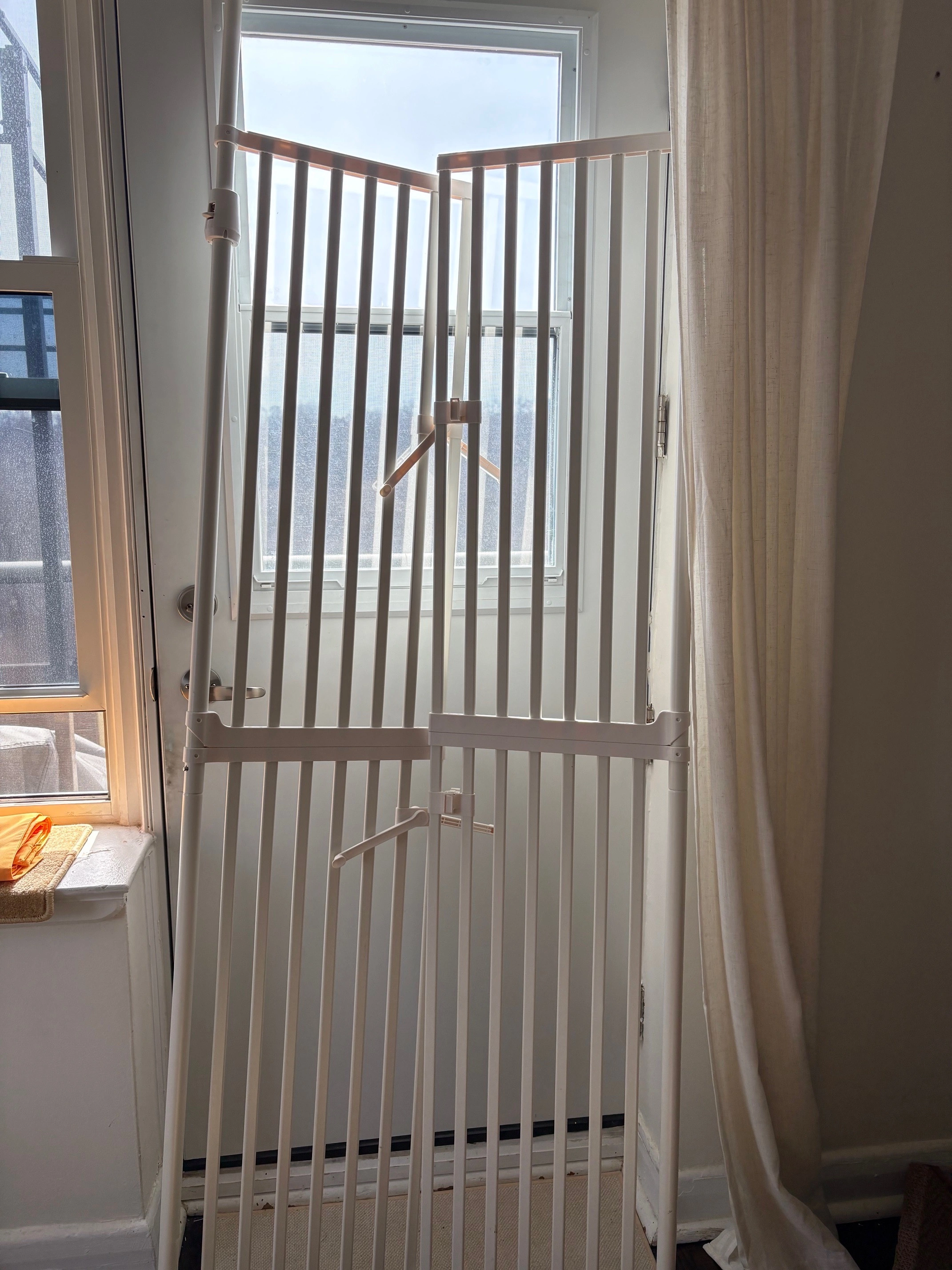 The measurements on this gate are 82" tall and then 32" wide. It's leaning on the door for the pic, but it is brand new.