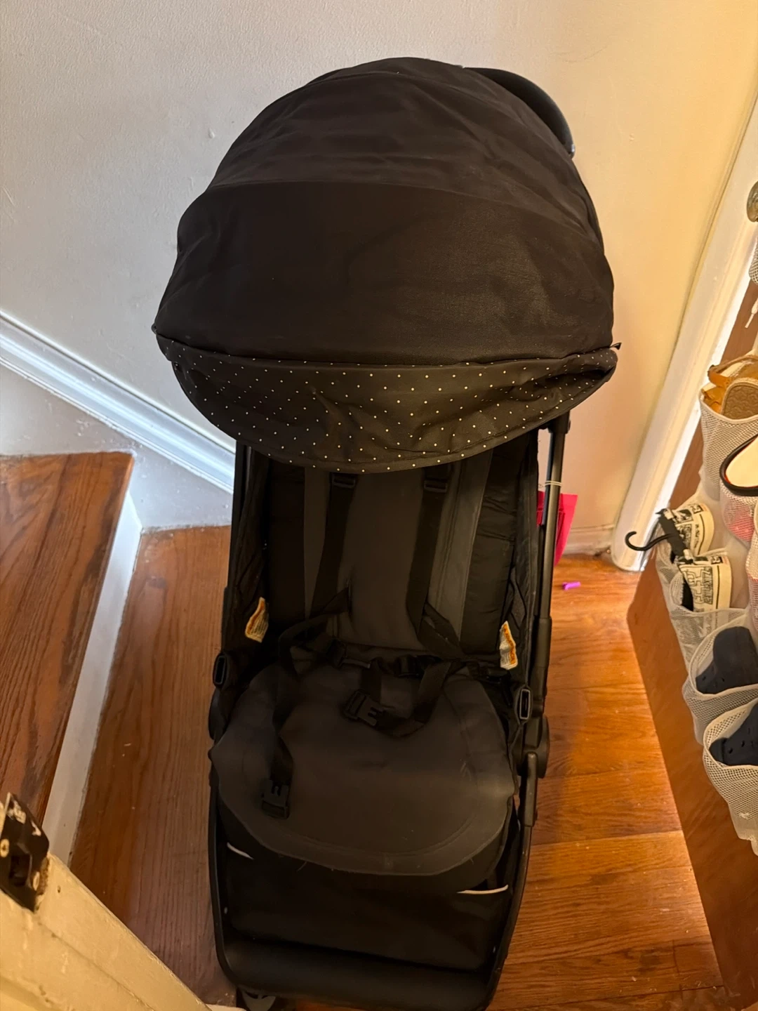 Selling a used baby stroller in black. It's in good condition and ready for a new home. Perfect for walks around the neighborhood or trips to the park!