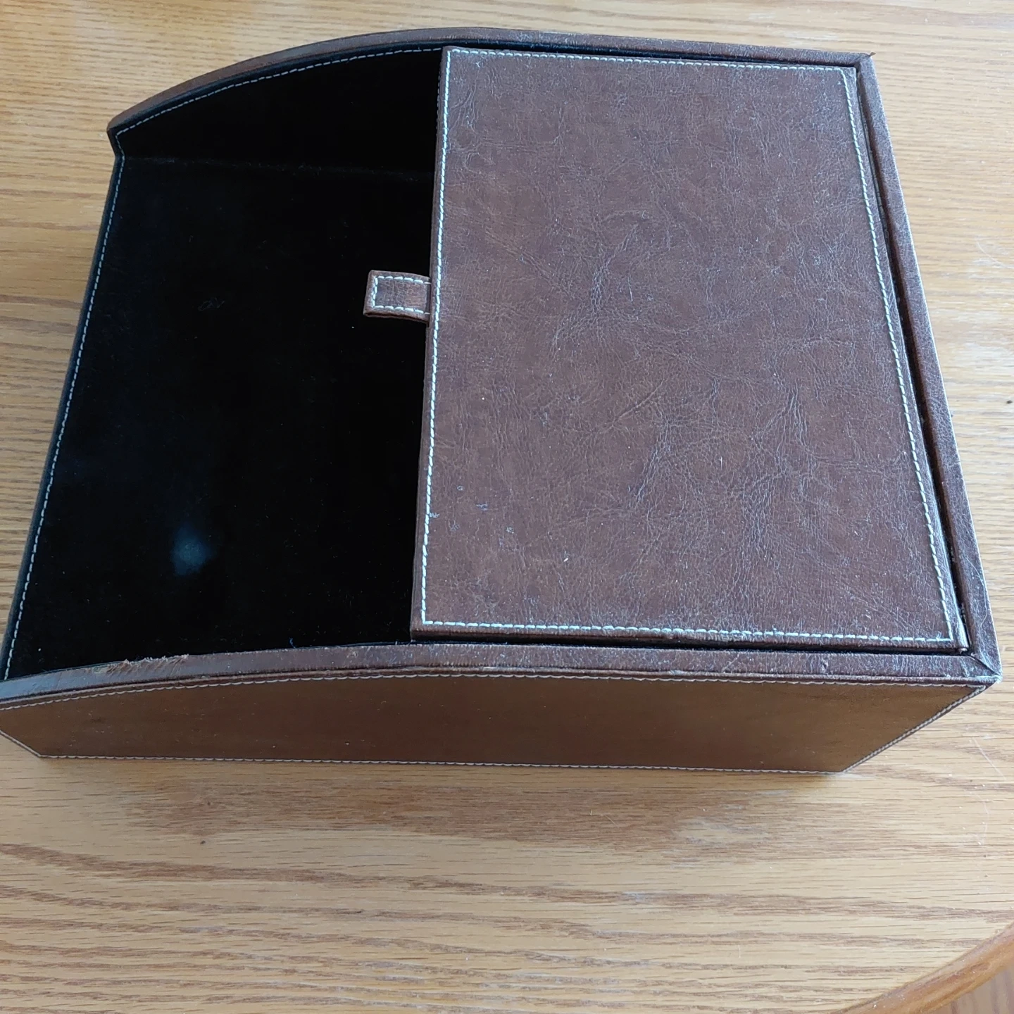 This is a brown faux leather desk organizer. It has a dark interior lining and white stitching detail. The flip-top lid helps keep contents tidy. Has some minor damge