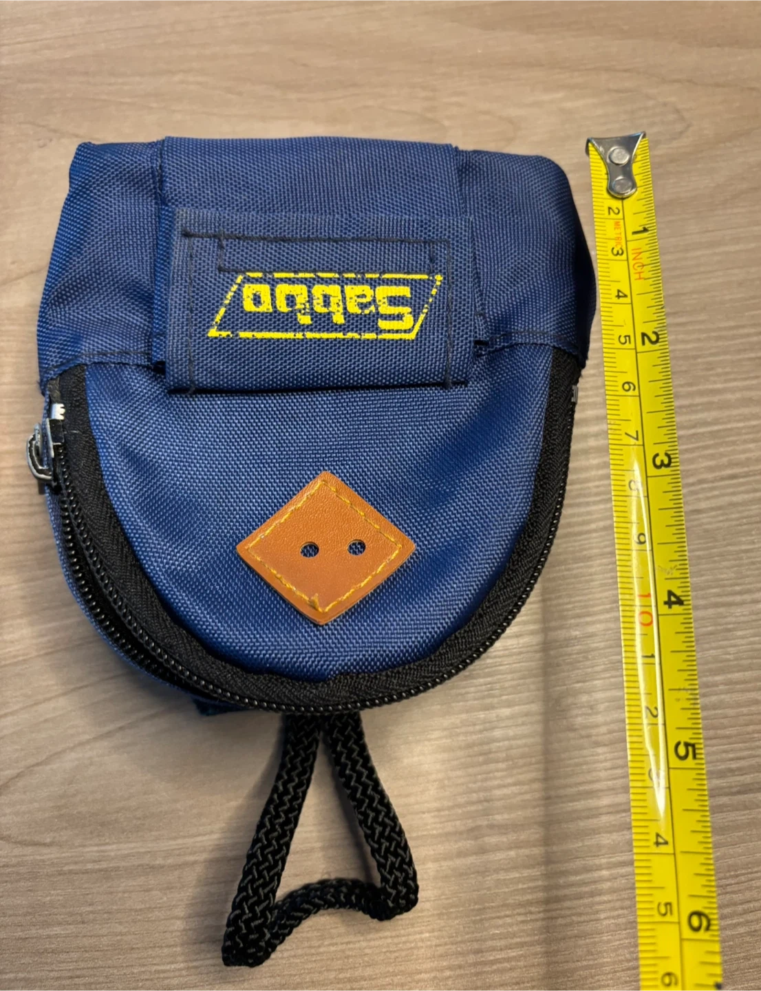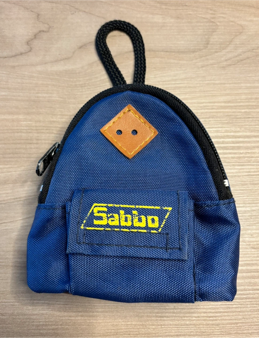 This is a blue zippered pouch bag with a front pocket and a loop for hanging. It has a small faux leather diamond detail on the front. The material appears to be durable nylon. Great for carrying small items like coins or earbuds!