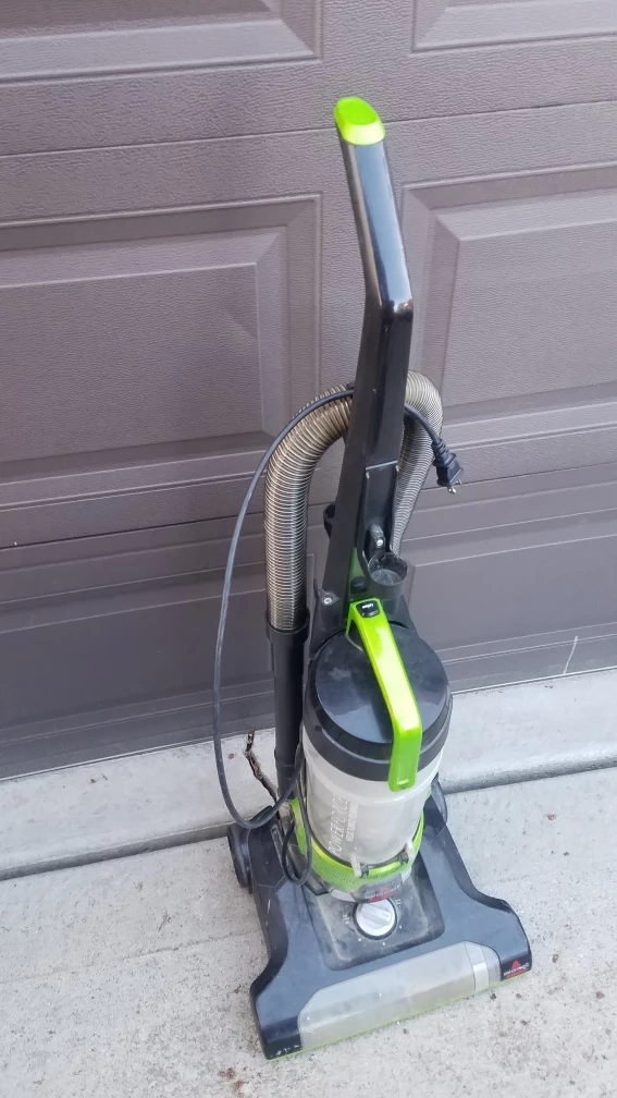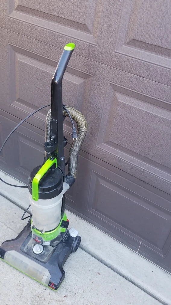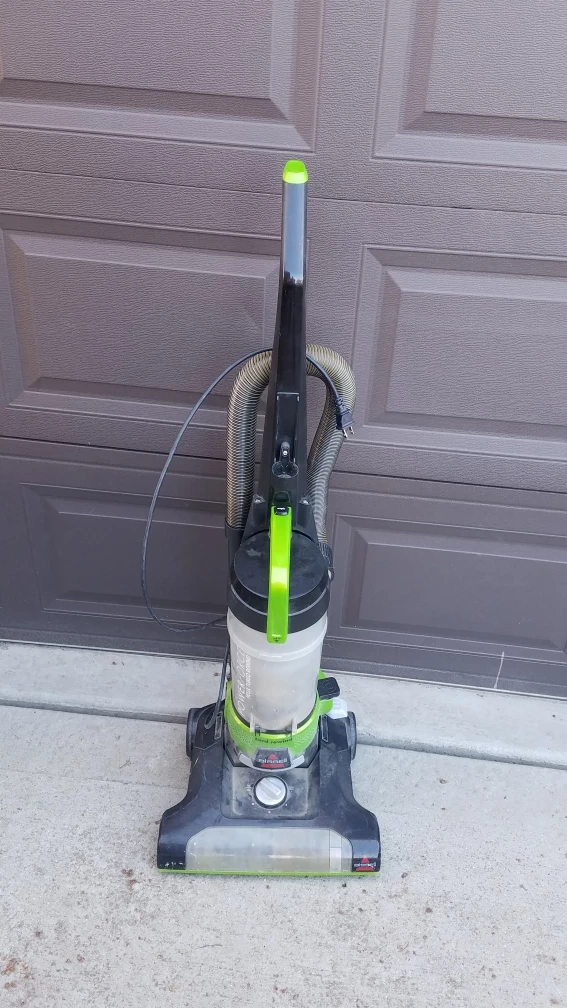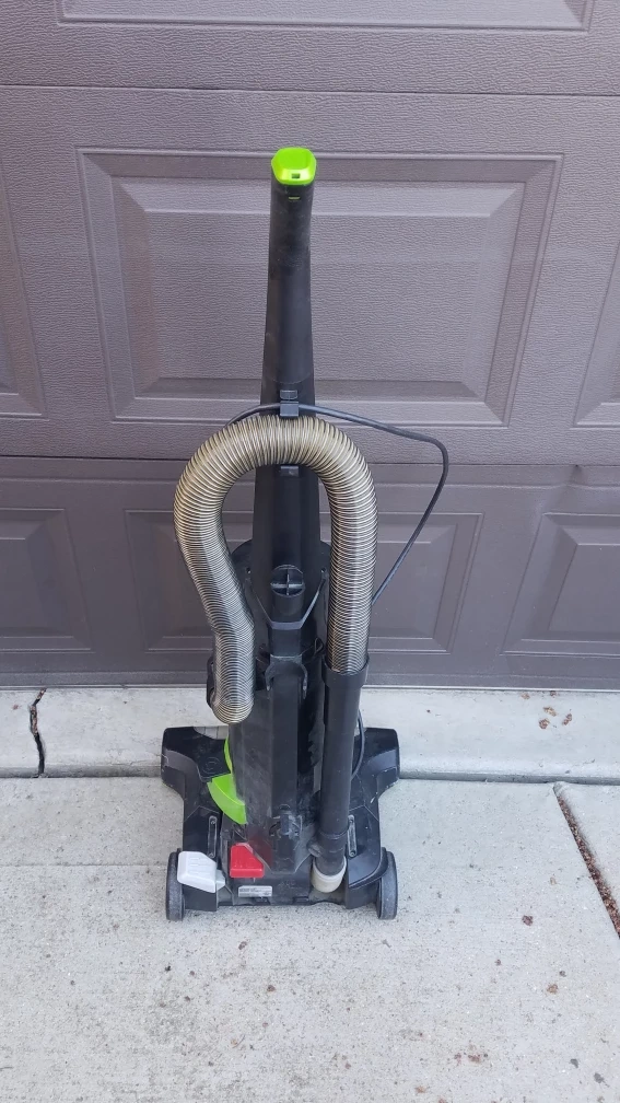 This is a Bissell upright vacuum cleaner. It's black and green with a clear dirt bin. It includes a flexible hose for extended reach.