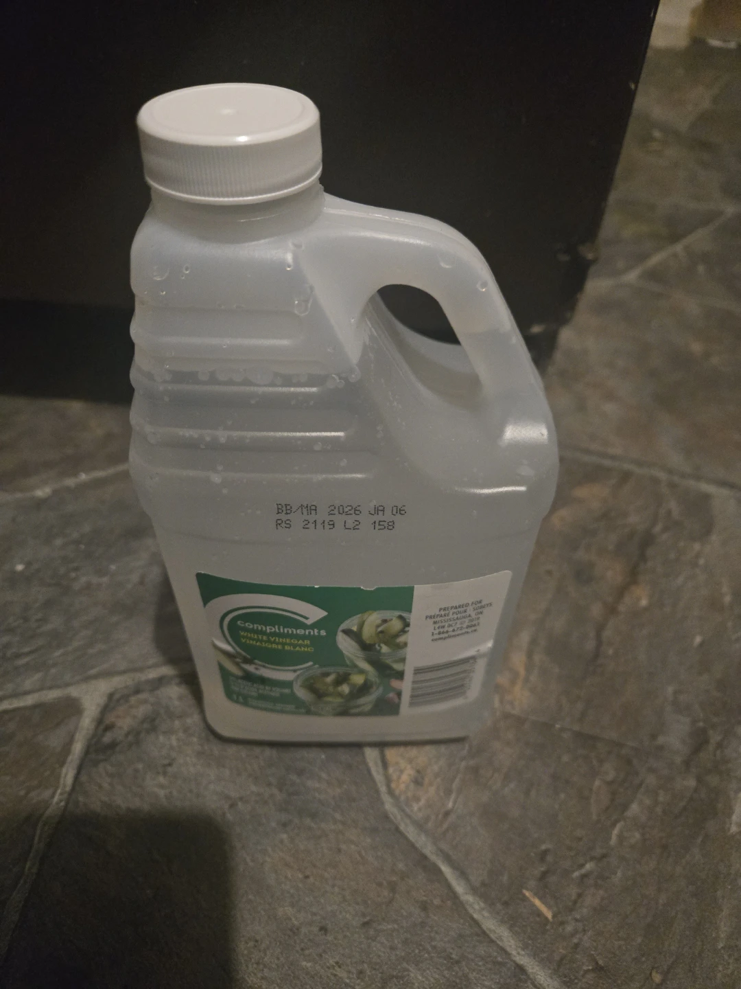 Compliments white vinegar in a 1L jug. Prepared for Sobeys. Best Before date is 2026 January 06. Not open