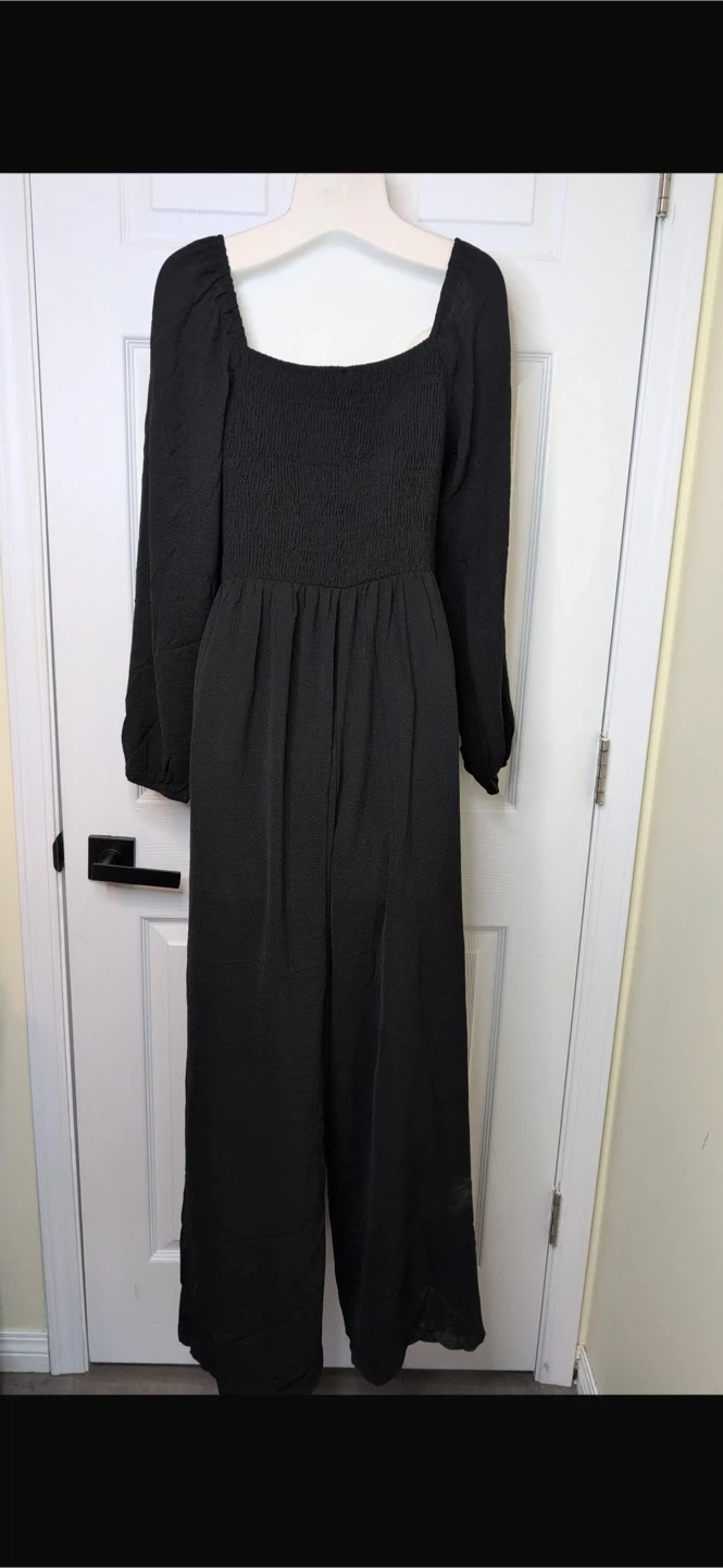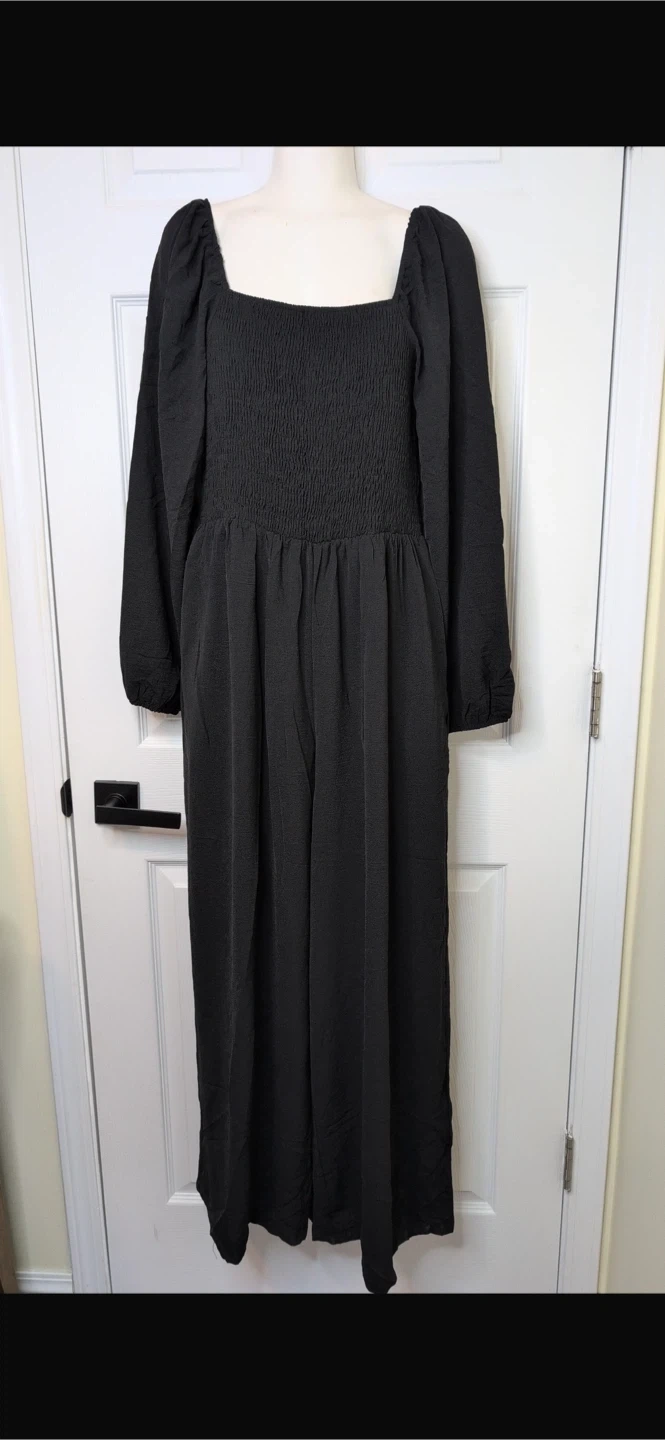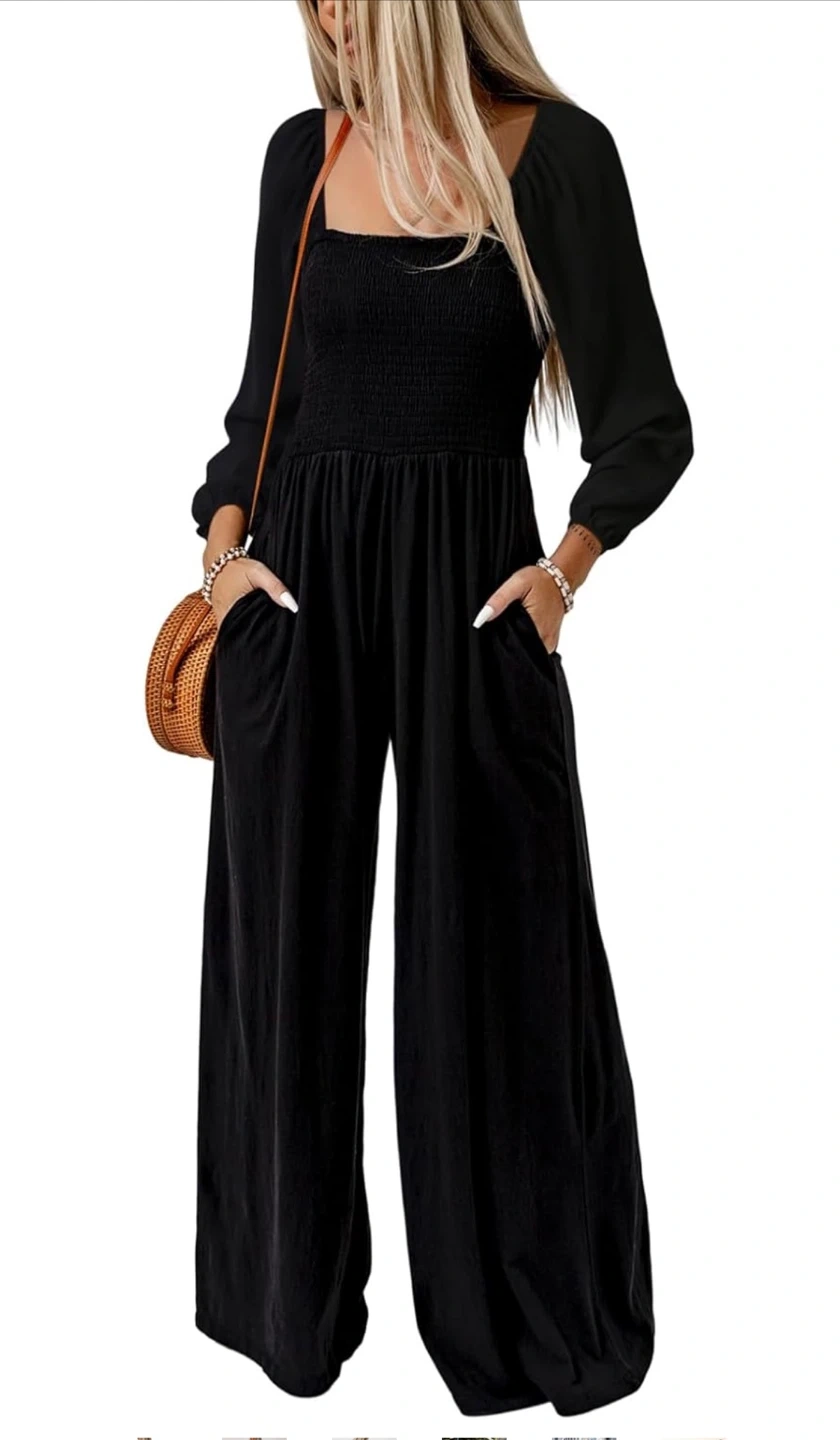 New! This black wide leg jumpsuit features a square neckline and long puff sleeves. It has a smocked bodice and practical side pockets. It's a comfortable and stylish one-piece option for various occasions. This jumpsuit is great for those seeking an effortless yet put-together look.