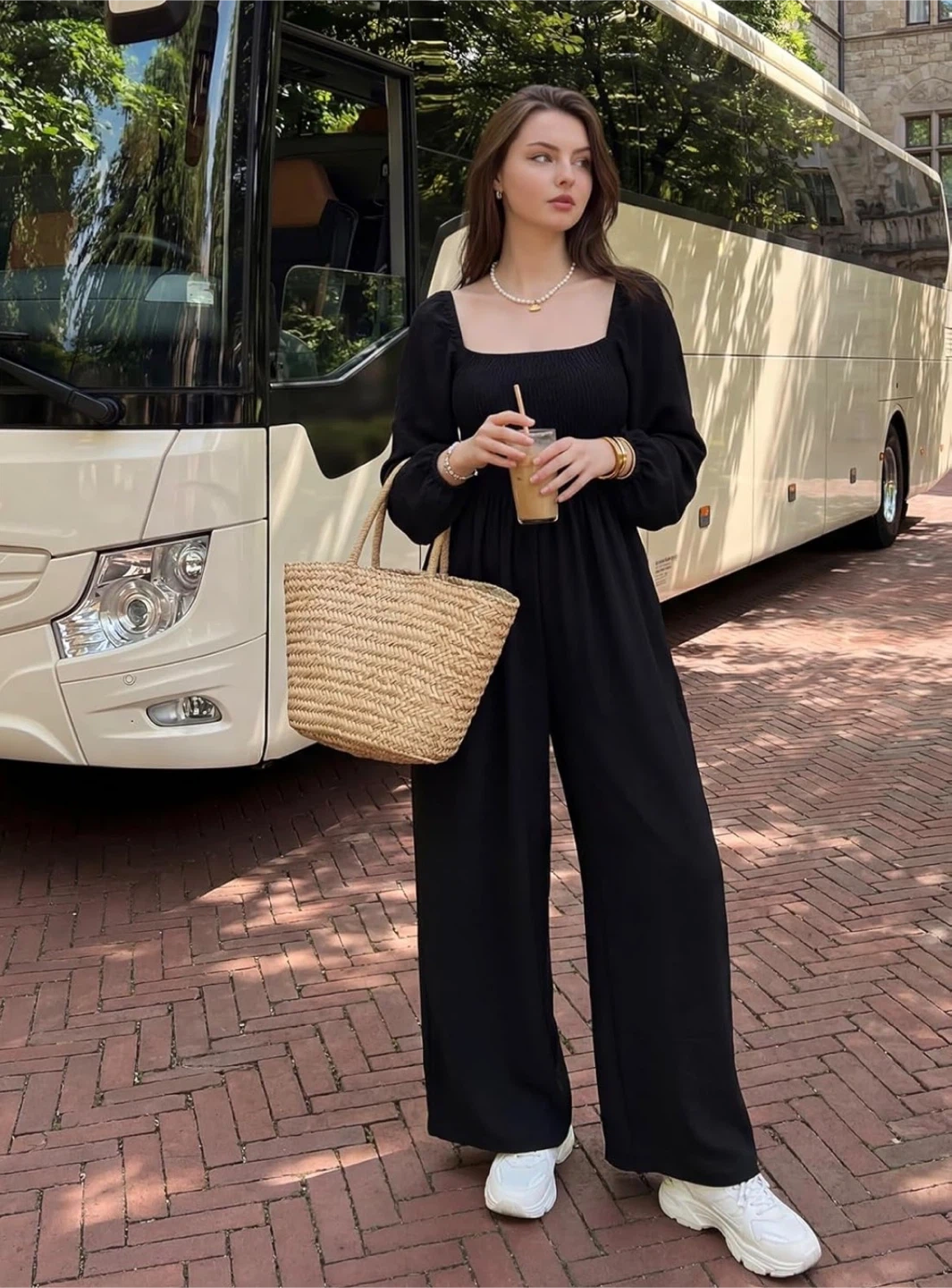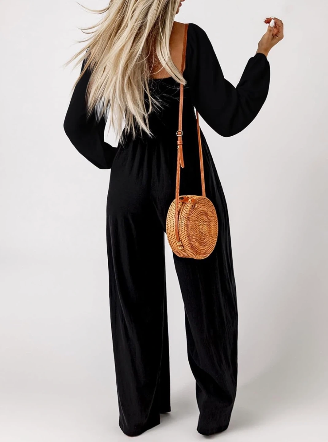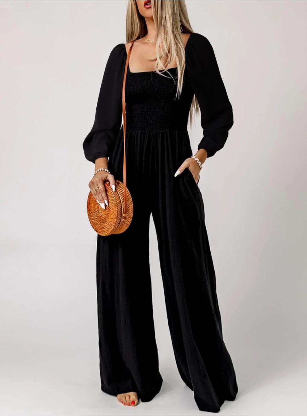 New! This black wide leg jumpsuit features a square neckline and long puff sleeves. It has a smocked bodice and practical side pockets. It's a comfortable and stylish one-piece option for various occasions. This jumpsuit is great for those seeking an effortless yet put-together look.
