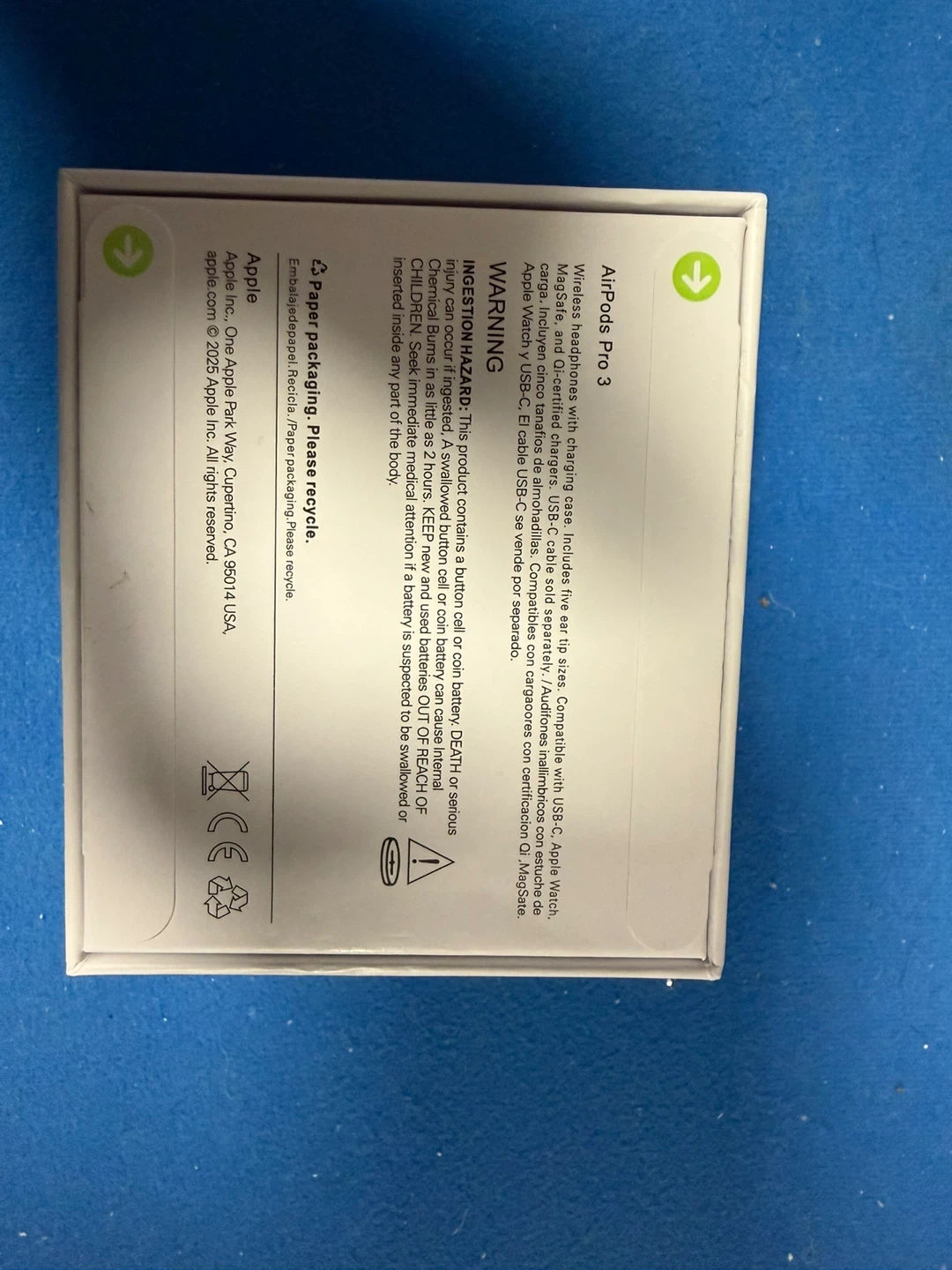 Apple AirPod Pro 3 with active noise cancellation. Compatible with USB-C, MagSafe, and Qi-certified chargers. This product includes five ear tip sizes and a USB-C charging cable. It connects wirelessly for audio and calls.