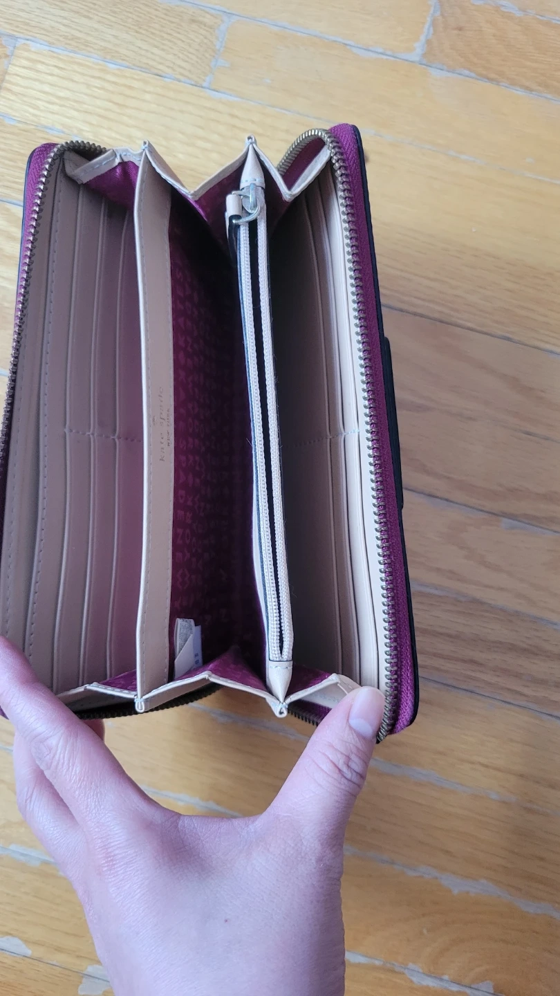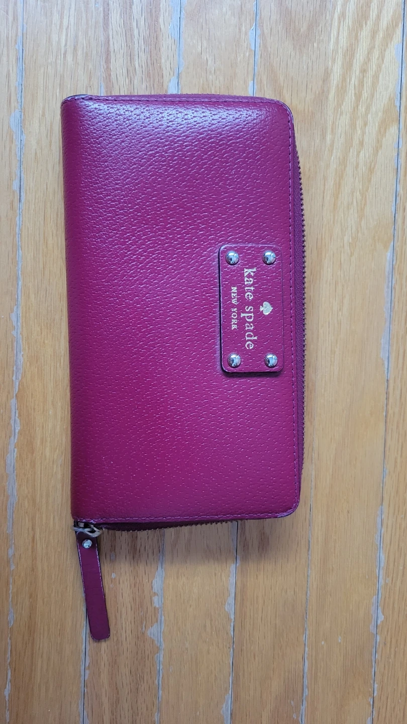 This Kate Spade New York wallet is crafted from magenta pebbled leather with a zip-around closure. It's designed with multiple interior compartments and card slots for organization. A great wallet for everyday use! Gently used.