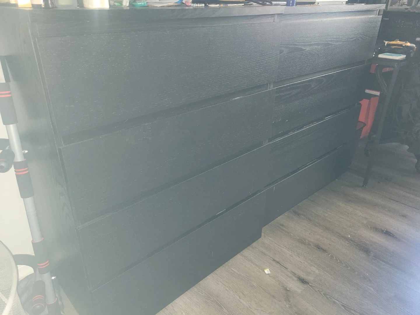 This is a black dresser with two sets of four drawers. Its wood grain finish adds a touch of style. It's a practical storage solution for any room.