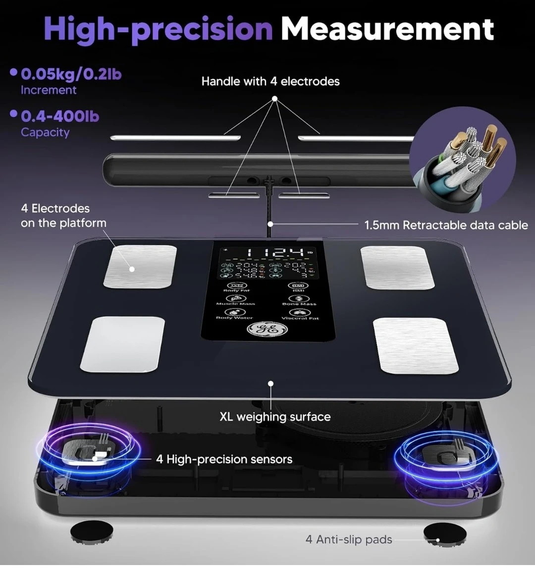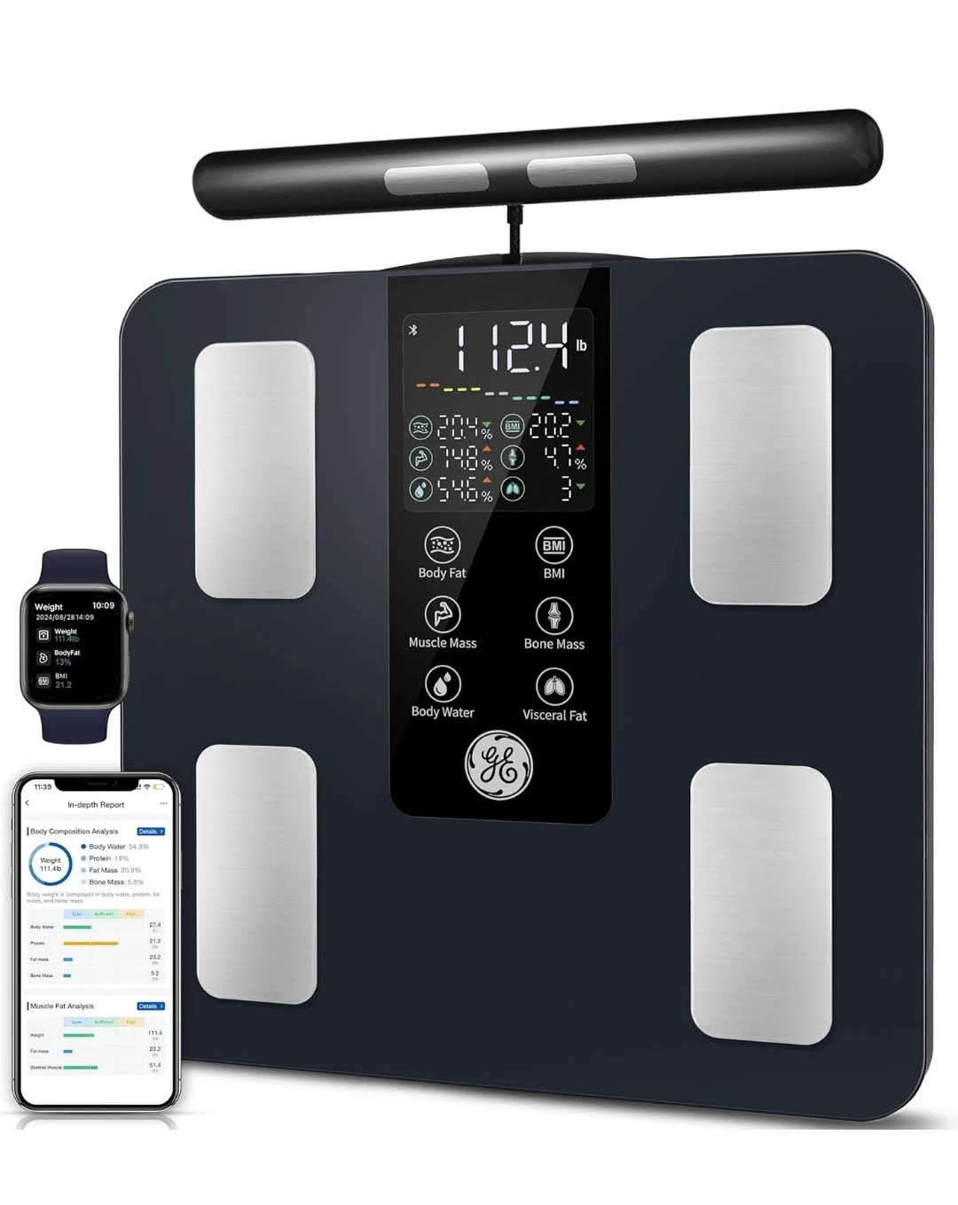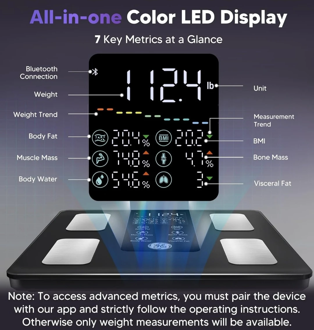 All-in-one color LED display shows 7 key metrics at a glance. Bluetooth connection syncs with the GE Fit Profile app for in-depth analysis and progress tracking. High-precision measurements with 0.05kg/0.2lb increments and a 400lb capacity.