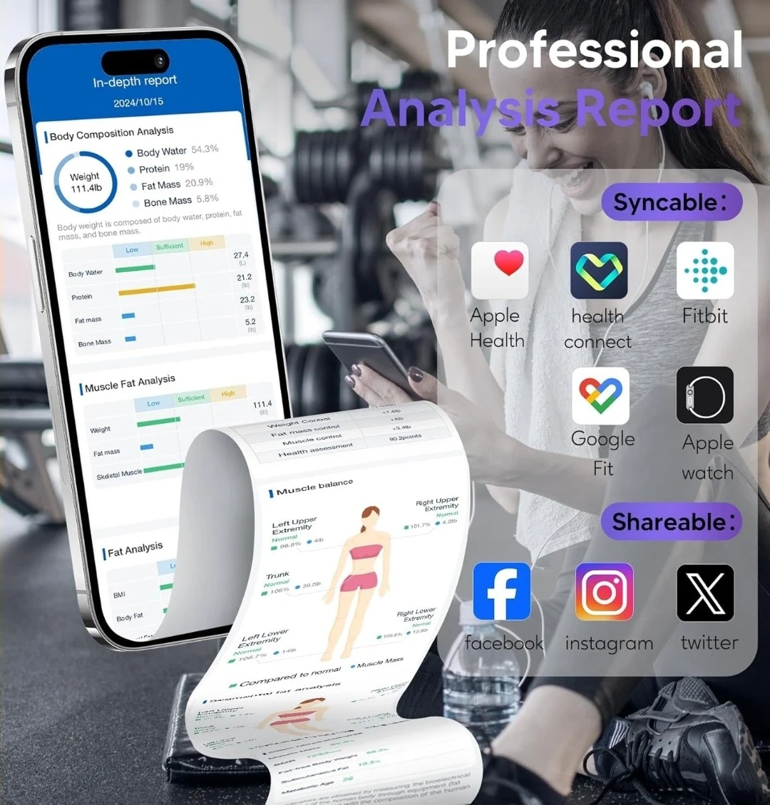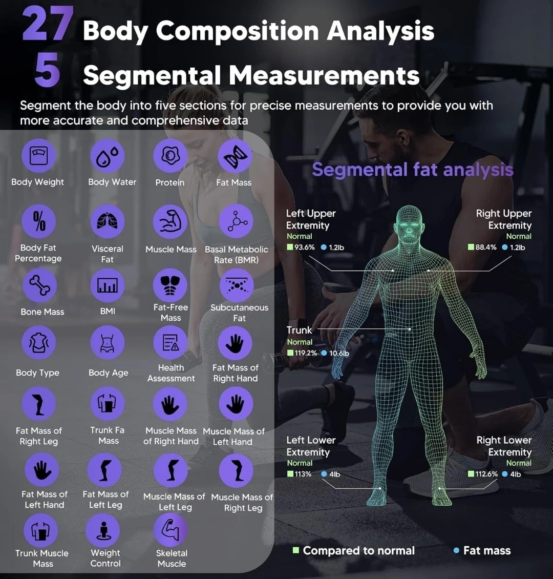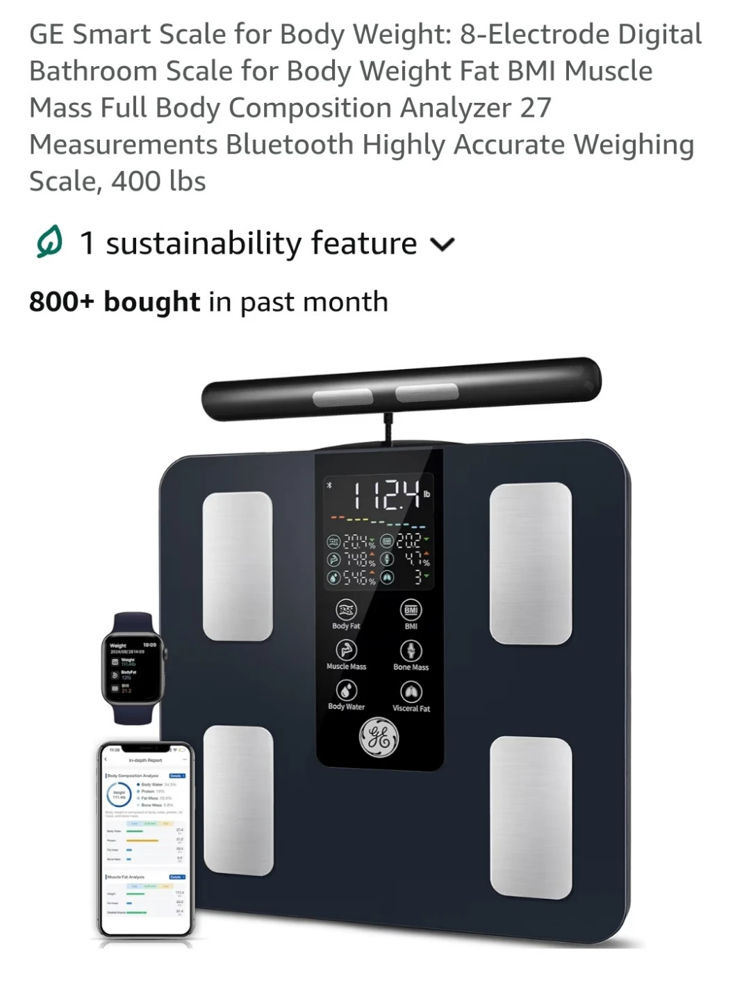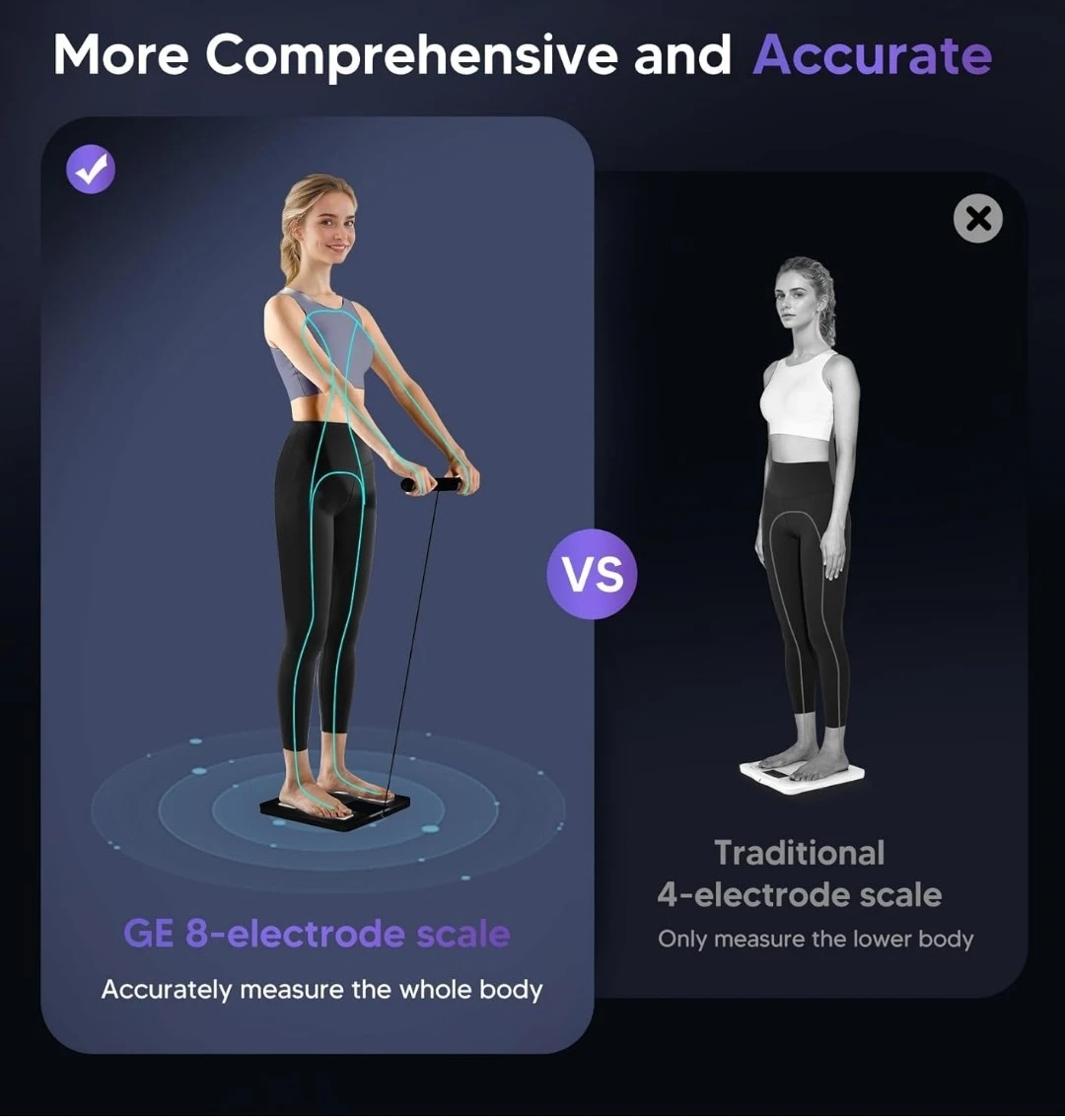 All-in-one color LED display shows 7 key metrics at a glance. Bluetooth connection syncs with the GE Fit Profile app for in-depth analysis and progress tracking. High-precision measurements with 0.05kg/0.2lb increments and a 400lb capacity.