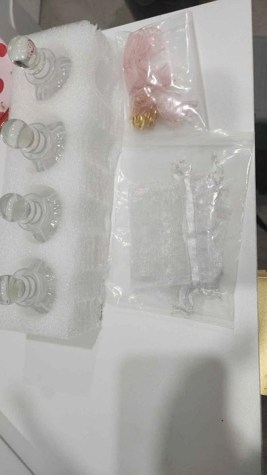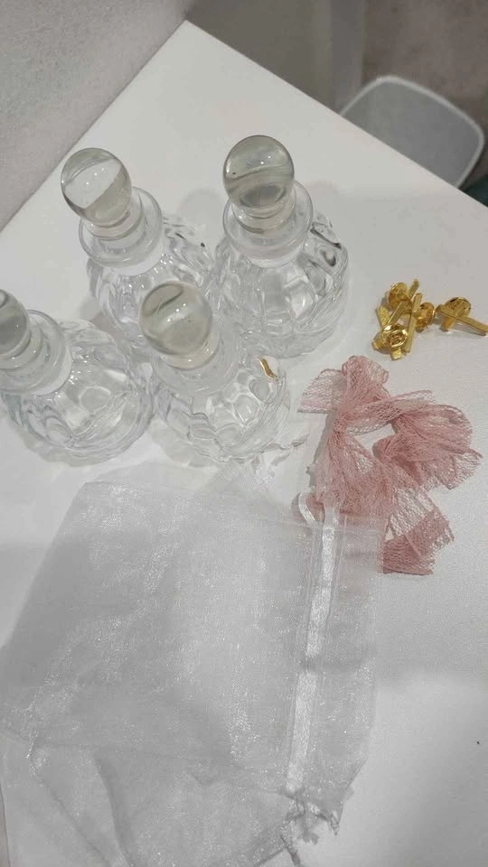 Cute set of 4 mini glass bottles, perfect for favors. Has little stoppers for each bottle. Comes with gold cross charms, pink lace ribbons, and white organza bags. Great for DIY baptism or communion favors. Price: $6 CASH ONLY. Meet Location: Pickering.