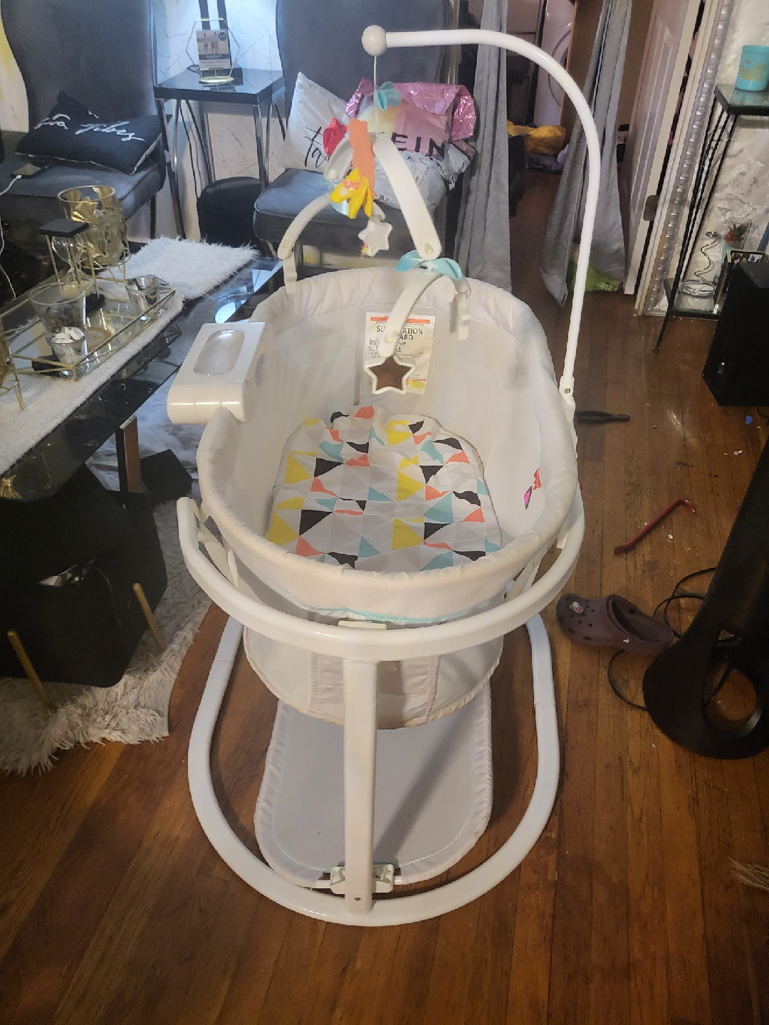 Selling a Fisher-Price Soothing Motions Bassinet in great condition! This bassinet is perfect for newborns and infants, providing a safe and comfortable sleeping space. It features gentle swaying motions, calming vibrations, and soothing music to help your baby drift off to sleep. The bassinet also has a convenient storage shelf underneath for keeping essentials close at hand. The white color is neutral and will fit in with any nursery decor