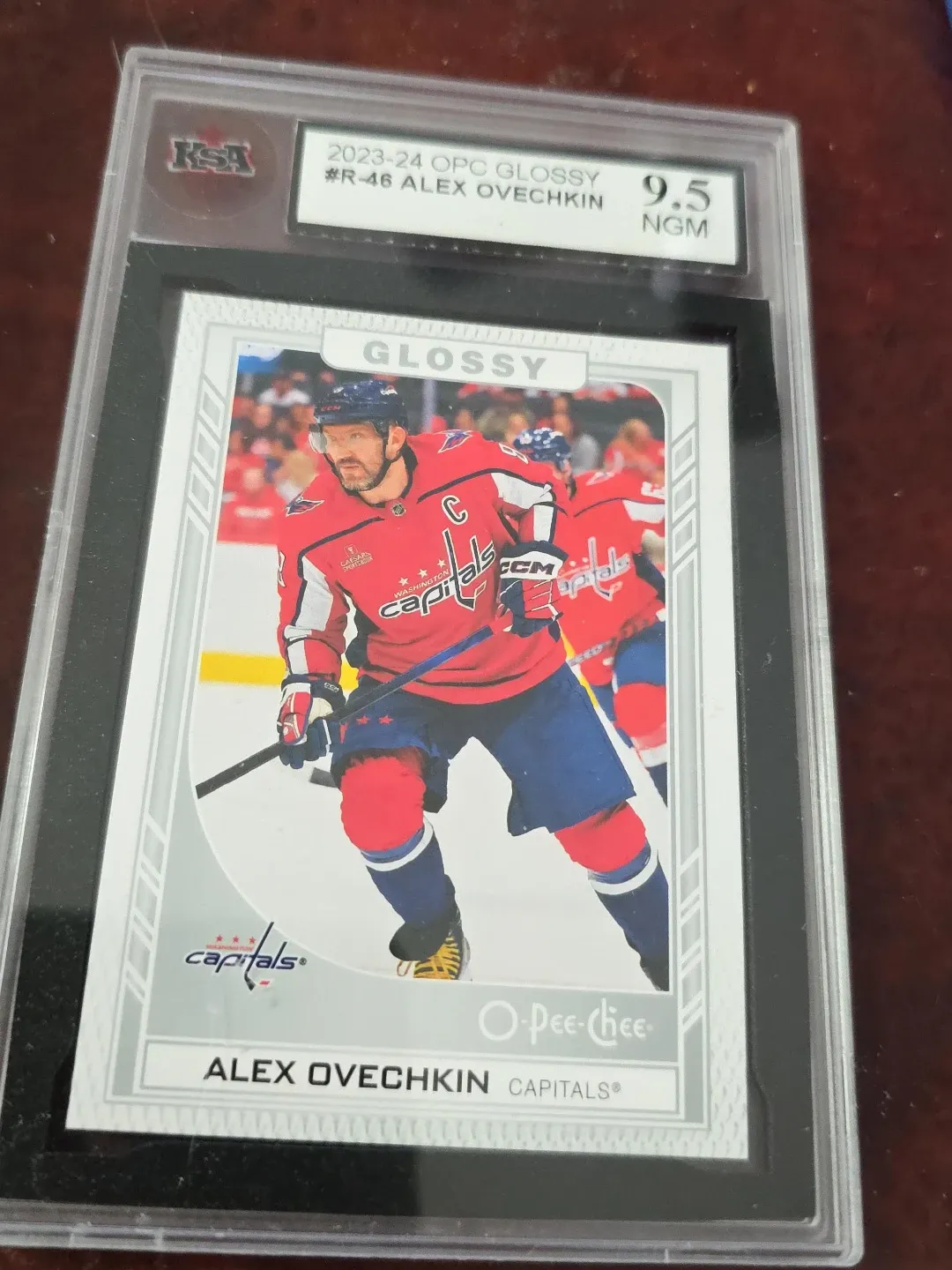 This is the 2023-24 Upper Deck OPC Glossy hockey card featuring Alex Ovechkin of the Washington Capitals. It's card #R-46 and has been professionally graded 9.5 NGM by KSA. The card depicts Ovechkin in his Capitals uniform.