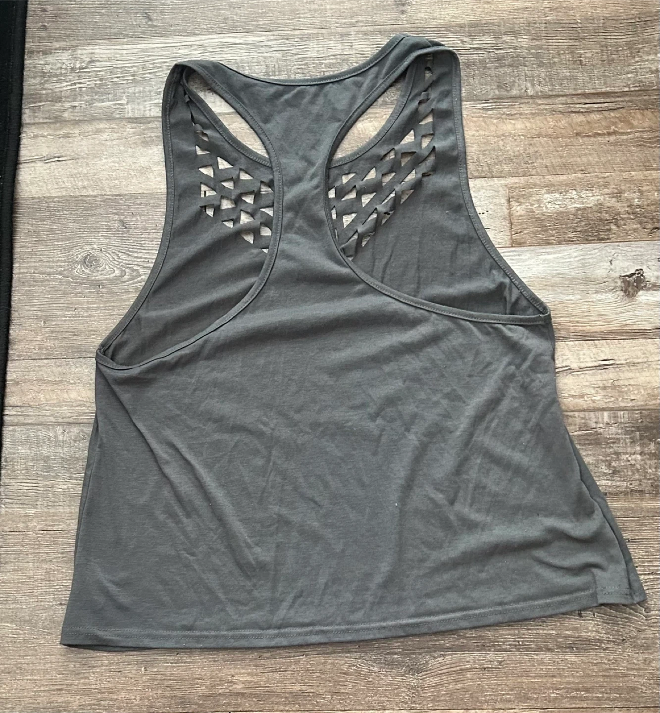 Grey lightly worn racerback tank top. Features a stylish cutout design on the upper back. Soft, comfortable fabric.