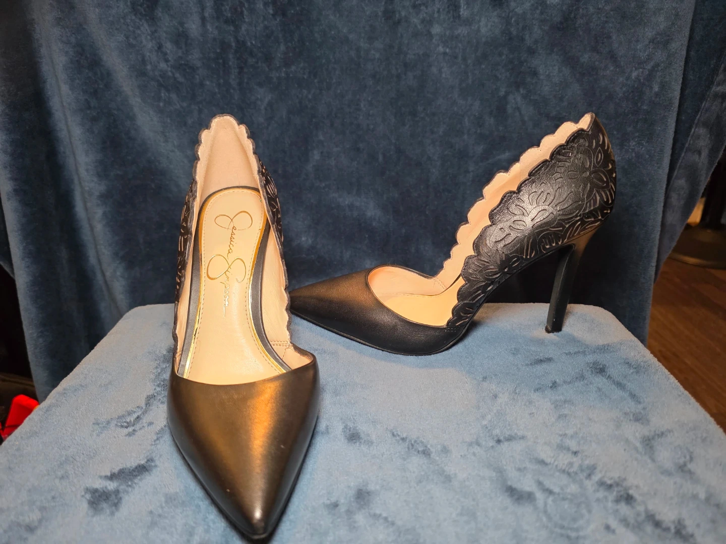 Selling a pair of Jessica Simpson black heels in size 6.5. These stylish shoes feature a unique floral design around the edges. They are in great condition and ready for a new home!