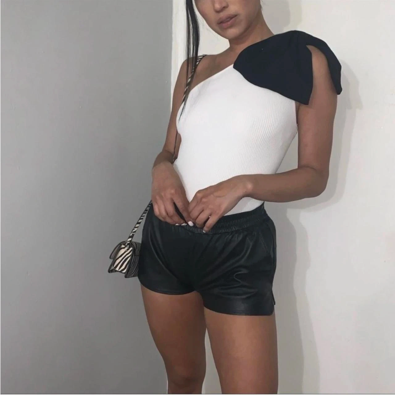 Selling a Zara one shoulder top in black and white. It's in great condition and ready for a new wardrobe! The top features a unique design with a contrasting white bow, pictures included to show what it looks like on :) size XS but can fit S, work twice just never reach for it