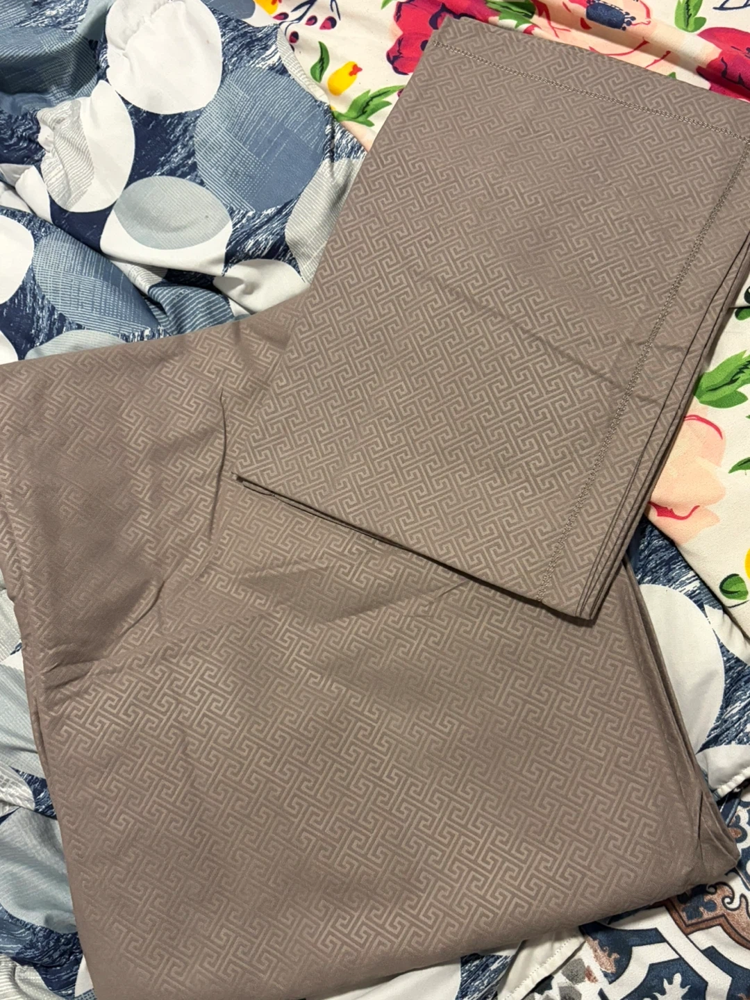 Selling a bed sheet set with a subtle geometric pattern. The colour is a neutral taupe. Perfect for adding a touch of understated elegance to your bedroom!