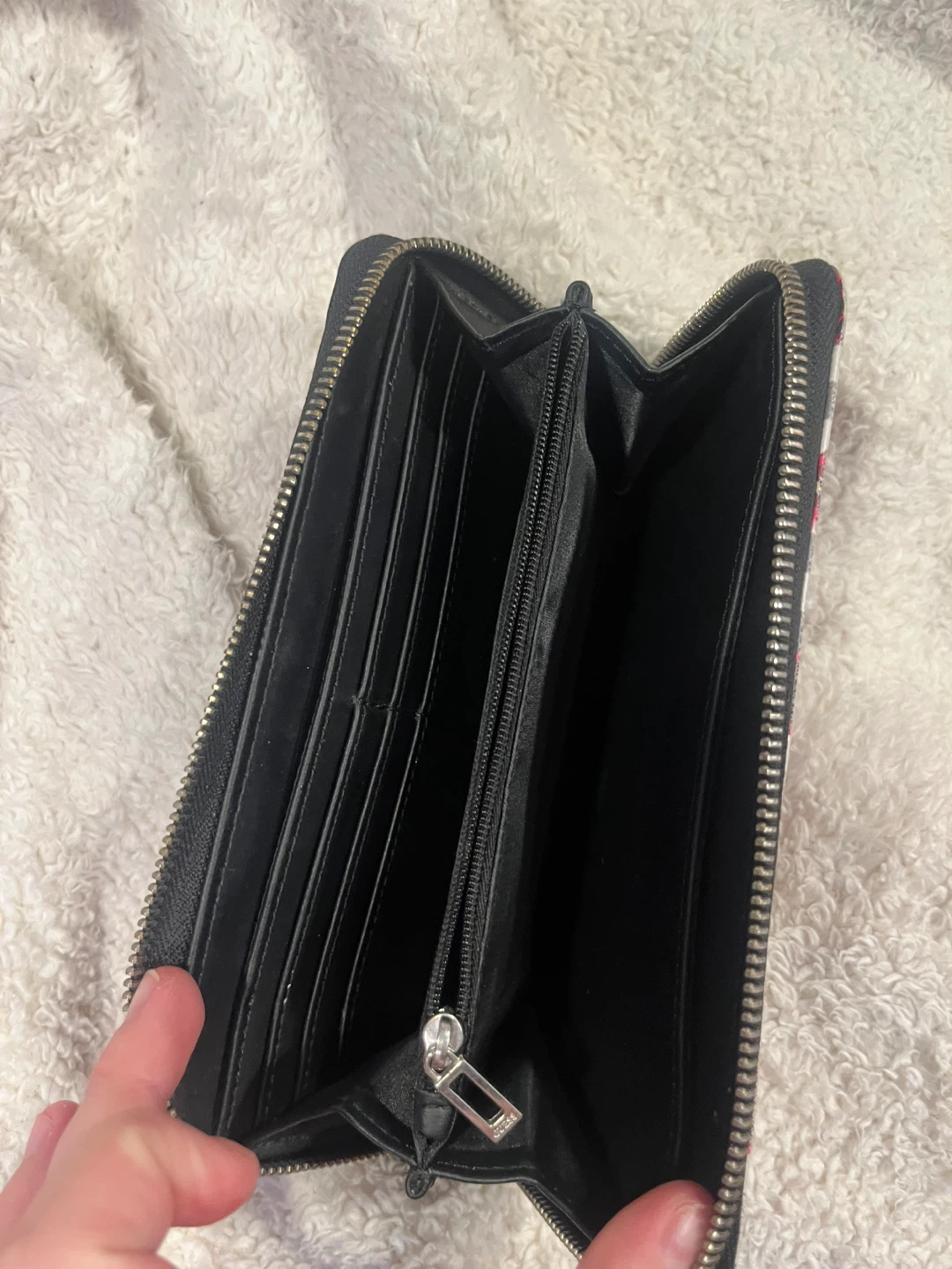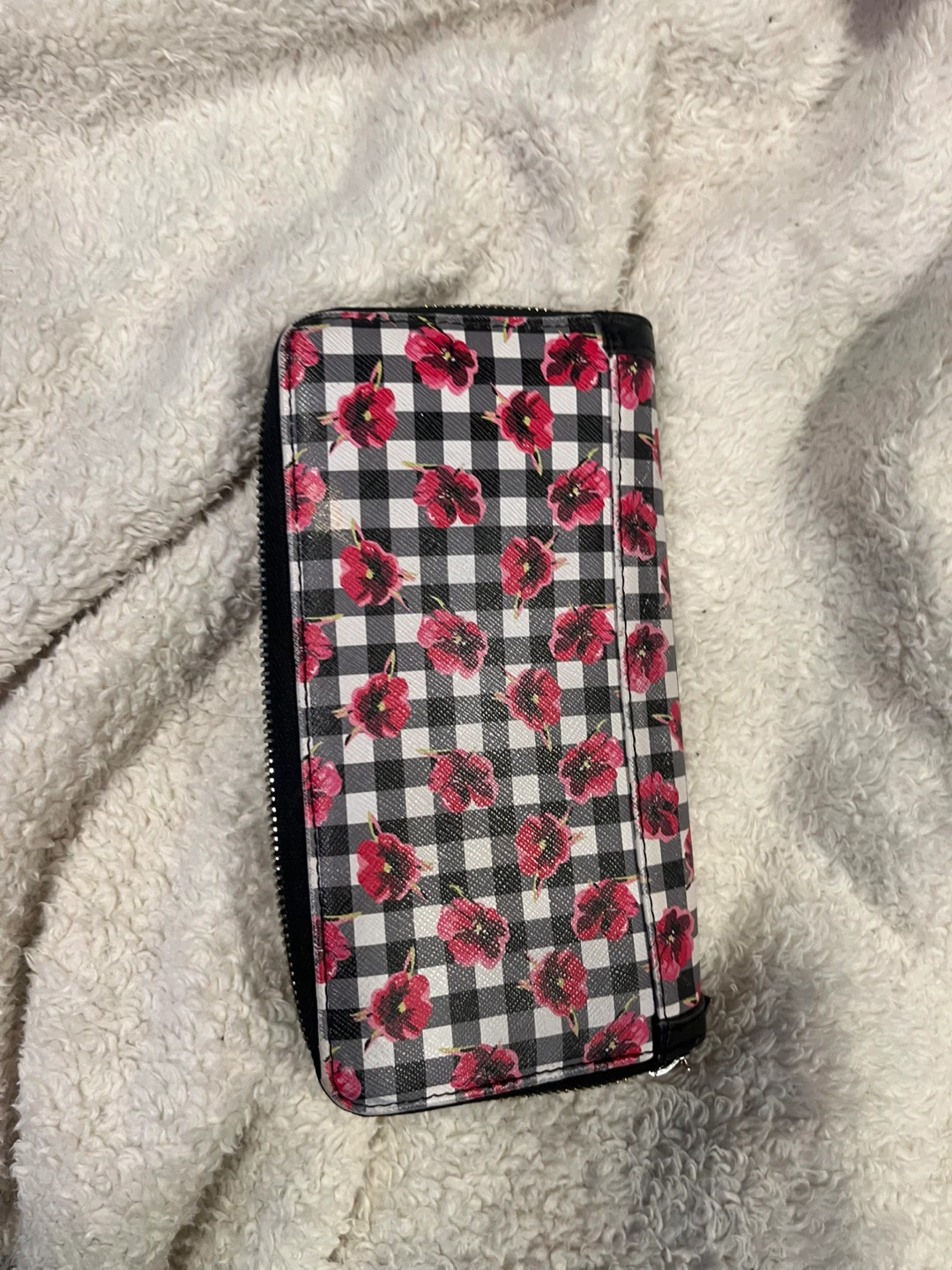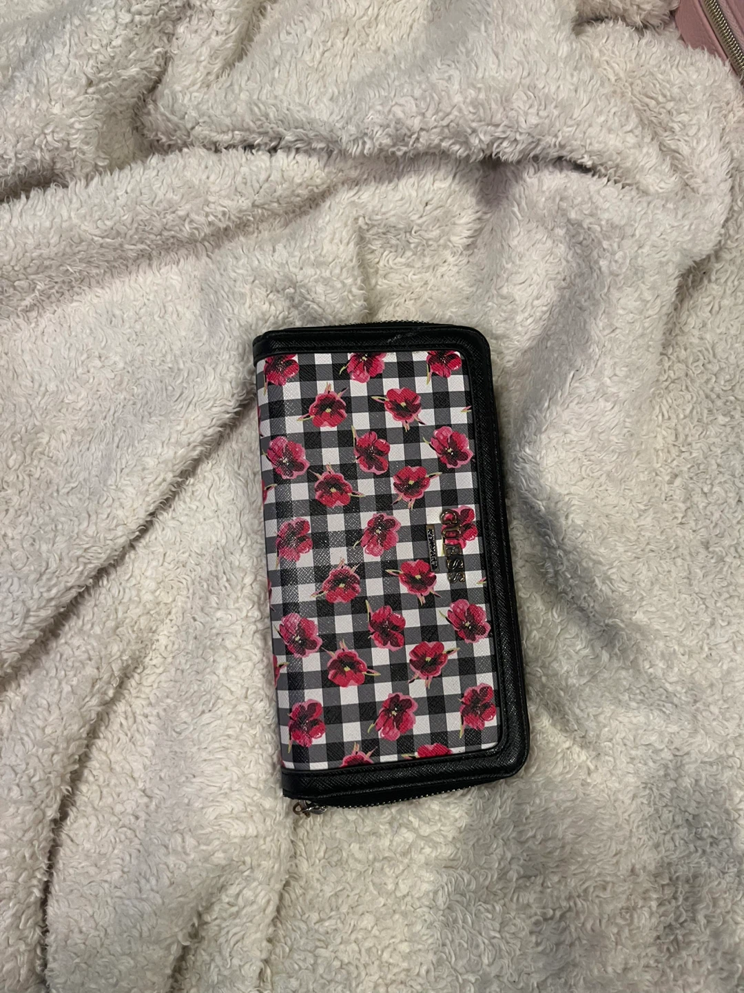 This Guess wallet features a fun floral and checkered design! It's a zip-around style with plenty of space for cards and cash. Great for adding a pop of colour to your everyday accessories