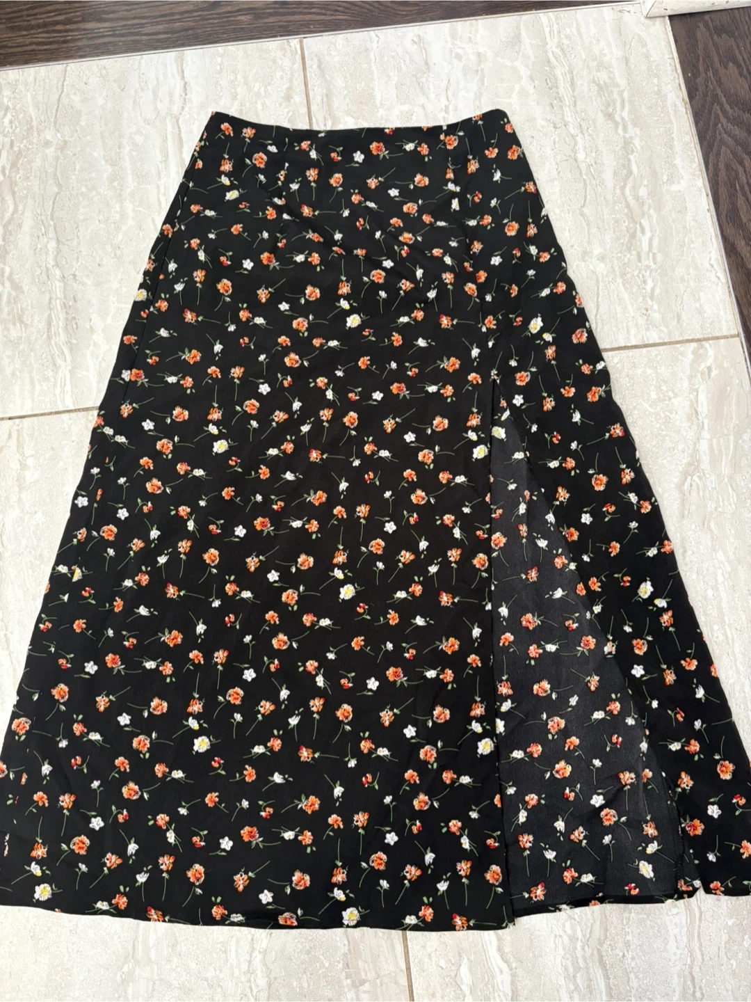 Super cute black floral skirt in size Small. Features a delicate orange and white floral print that stands out beautifully against the black background. The flowy, A-line style is very flattering and easy to wear, and it has a subtle side slit that adds a stylish touch.