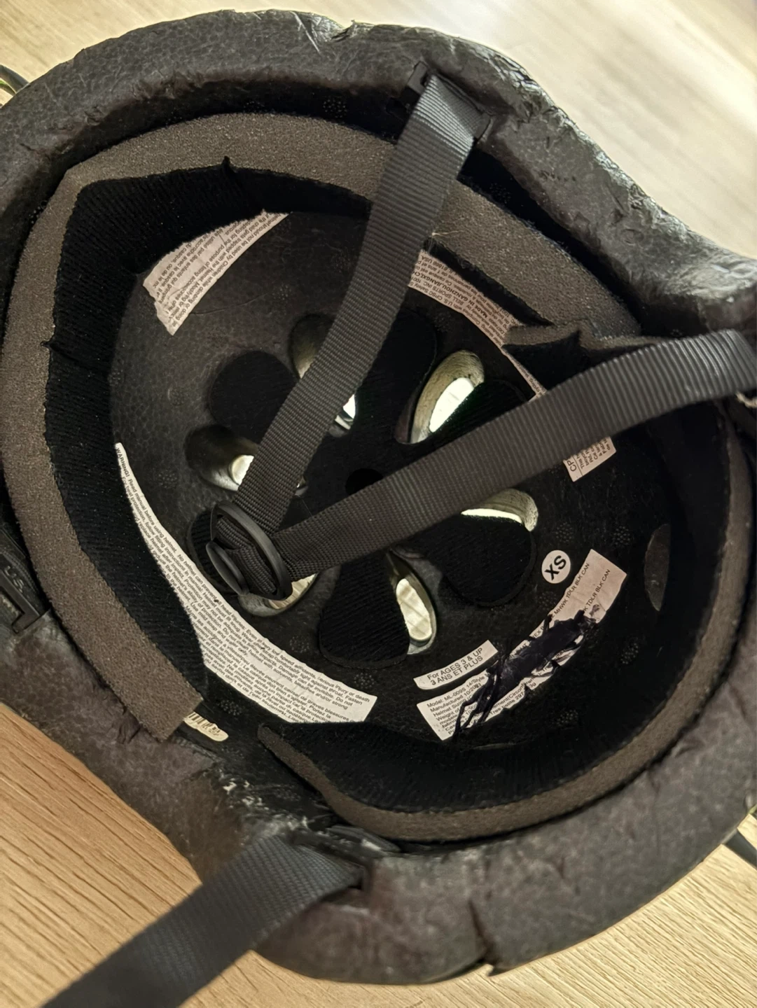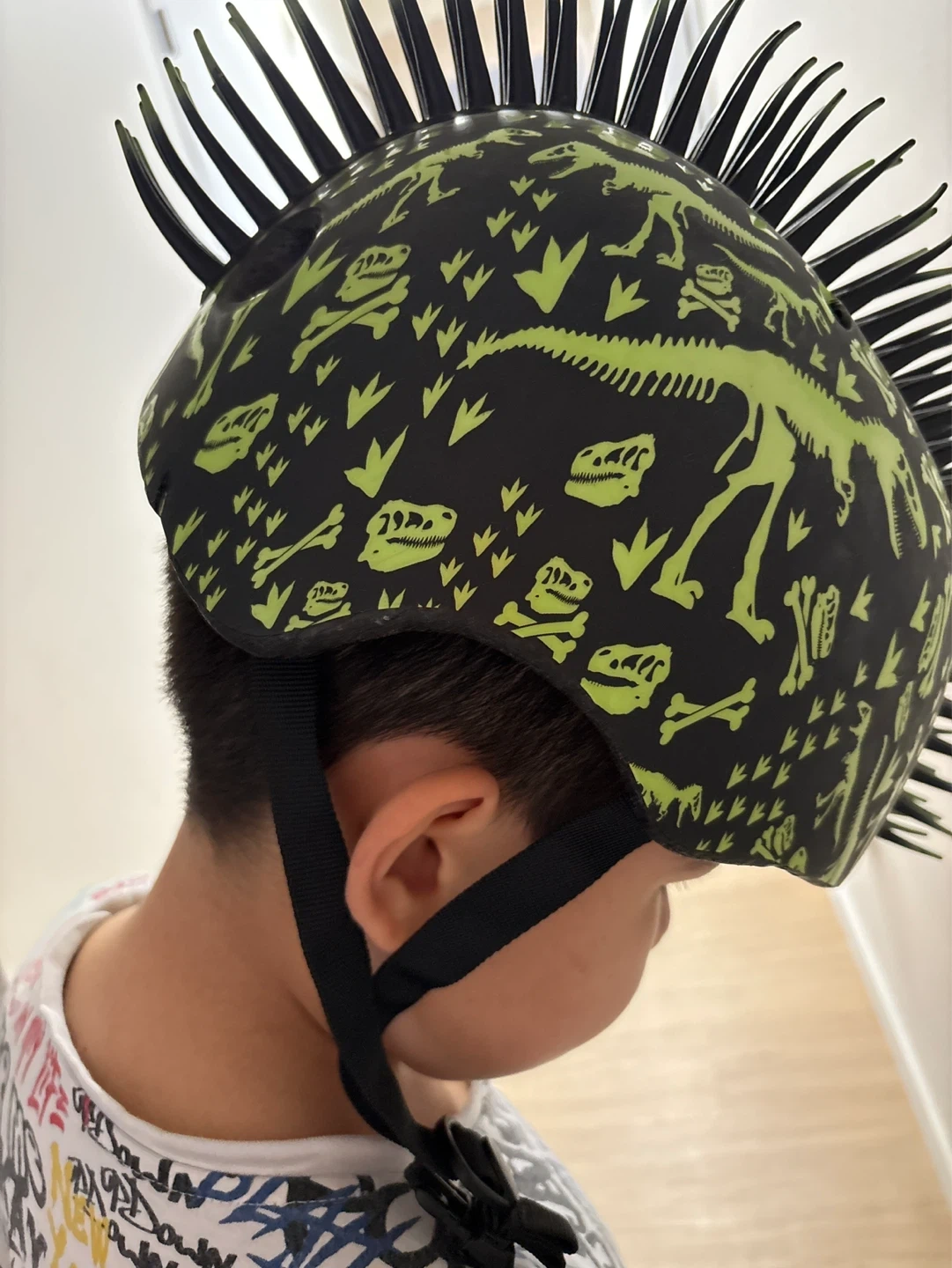 This kids' helmet features a fun dinosaur and bone pattern with a cool mohawk. It's an XS size and perfect for young cyclists. Designed for safety and style!
