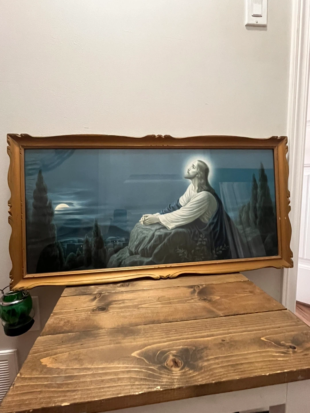 Vintage 1920 Jesus Christ praying picture print in vintage wooden framed. Good vintage condition.