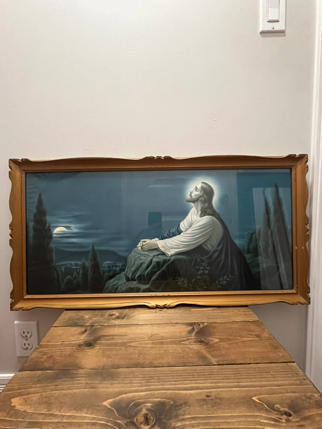 Vintage 1920 Jesus Christ praying picture print in vintage wooden framed. Good vintage condition.