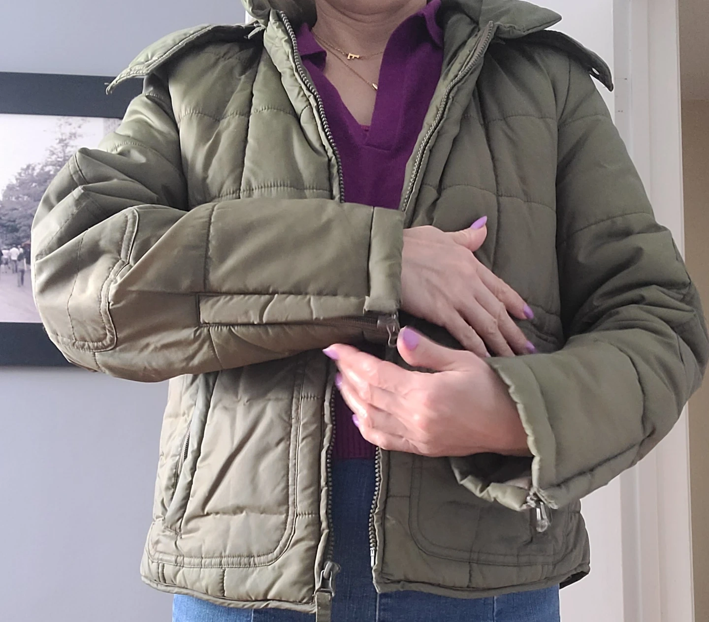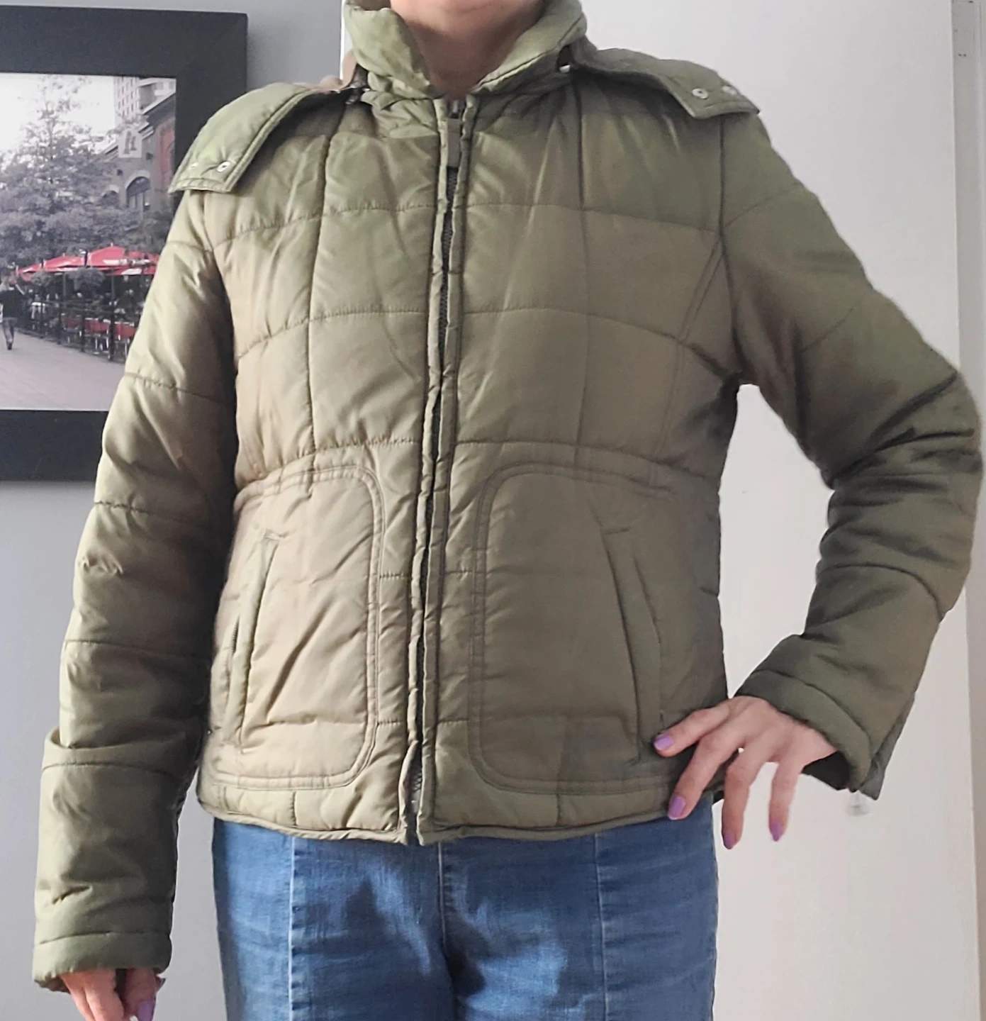 This olive green puffer jacket is perfect for staying warm and stylish! It features a quilted design and a cozy hood. It's in great condition and ready for a new owner