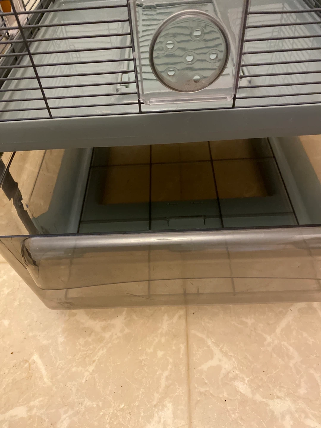 This pet cage comes with a water bottle, a food dish, and a small ramp. It has a wire top and plastic base for easy cleaning. It's suitable for small animals like hamsters or gerbils. Includes original packaging.