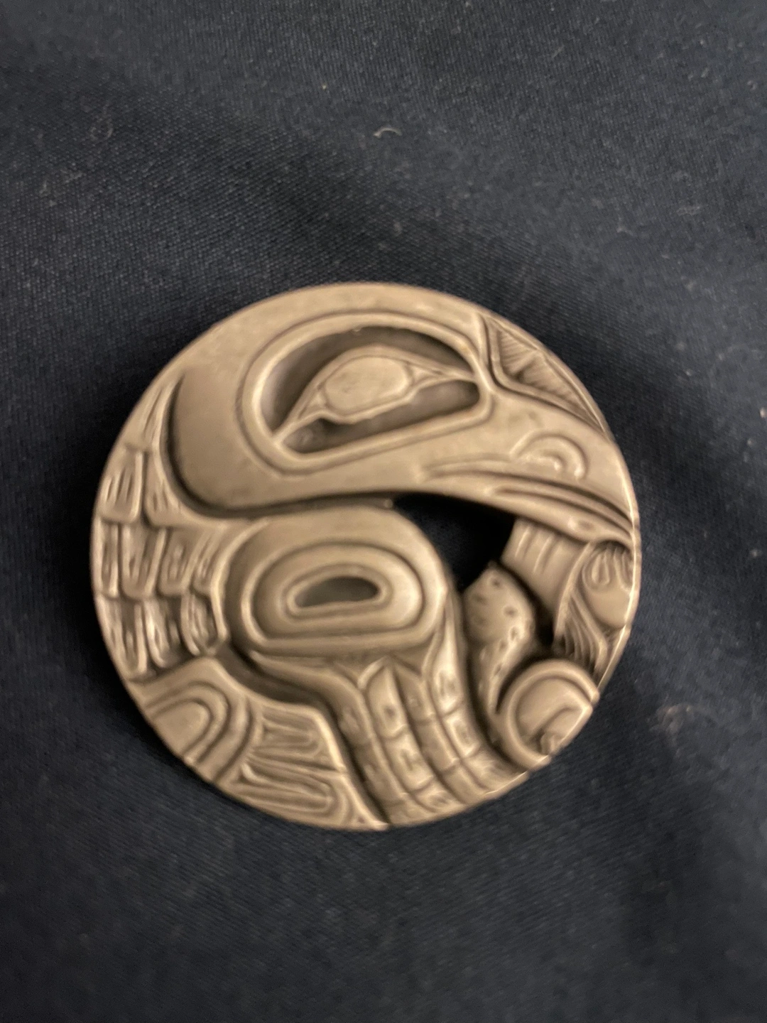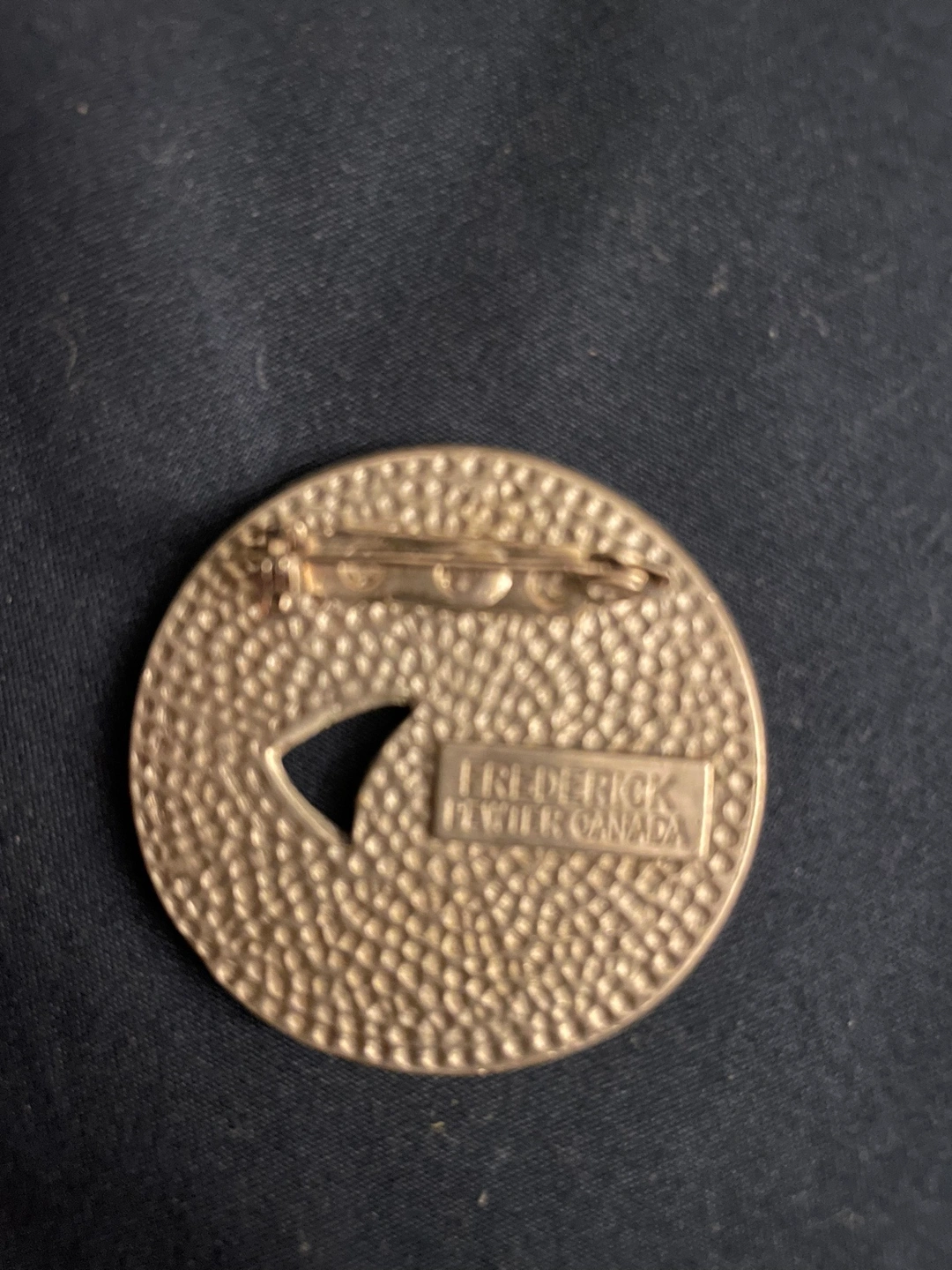 This vintage Frederick Pewter Canada Raven Brooch/Pin is a unique addition to any jewelry collection. The round shape and silver color make it a versatile piece that can be worn with any outfit. The brooch is made of pewter and was manufactured in Canada, adding to its authenticity and value. The intricate design of the raven brooch makes it a statement piece that is sure to catch the eye. Whether you're a collector of vintage jewelry or just looking for a unique accessory, this brooch is a must-have. Add it to your collection today and enjoy the timeless beauty it brings.