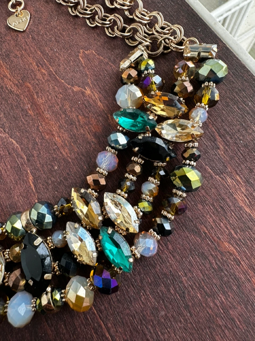This Aldo statement necklace is sure to turn heads! It features a gold-tone chain and multi-coloured stones in shades of green, black, gold, and purple. The necklace is approximately 9 inches long.