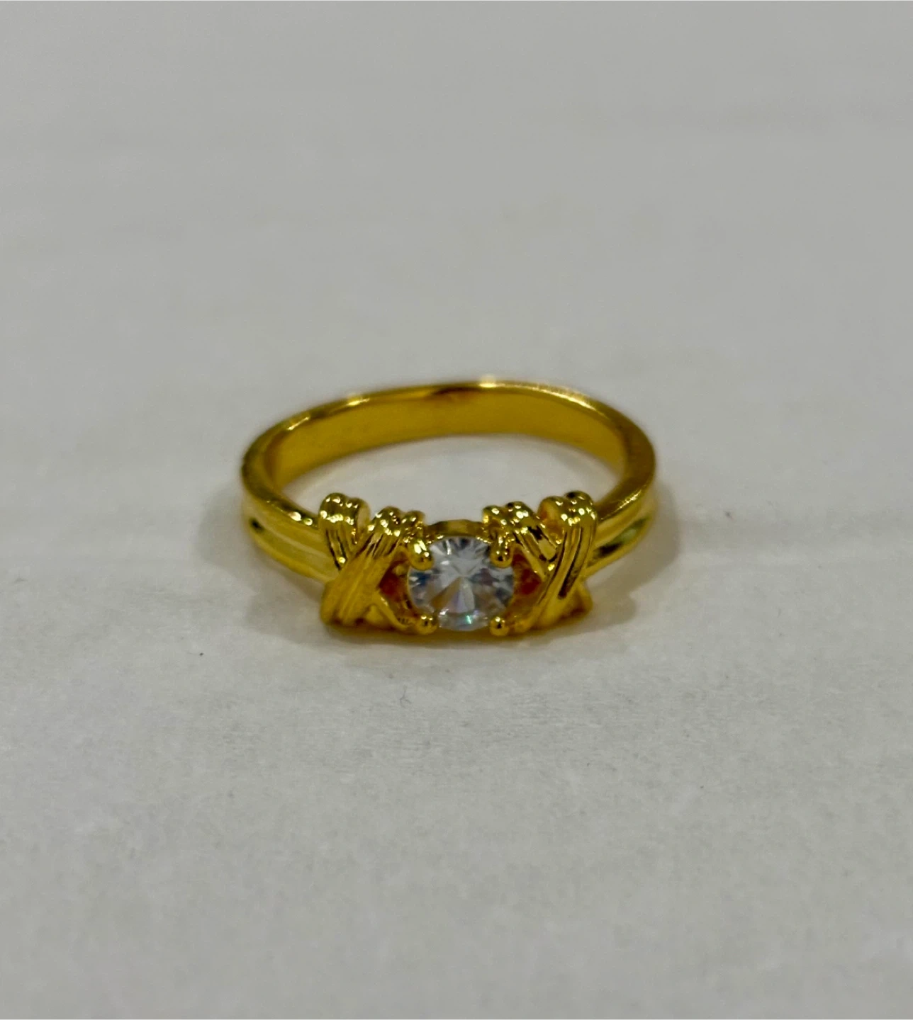 A gold plated ring featuring a clear oval-cut stone. The band has a twisted crisscross design. It's a lovely accessory for everyday wear.
