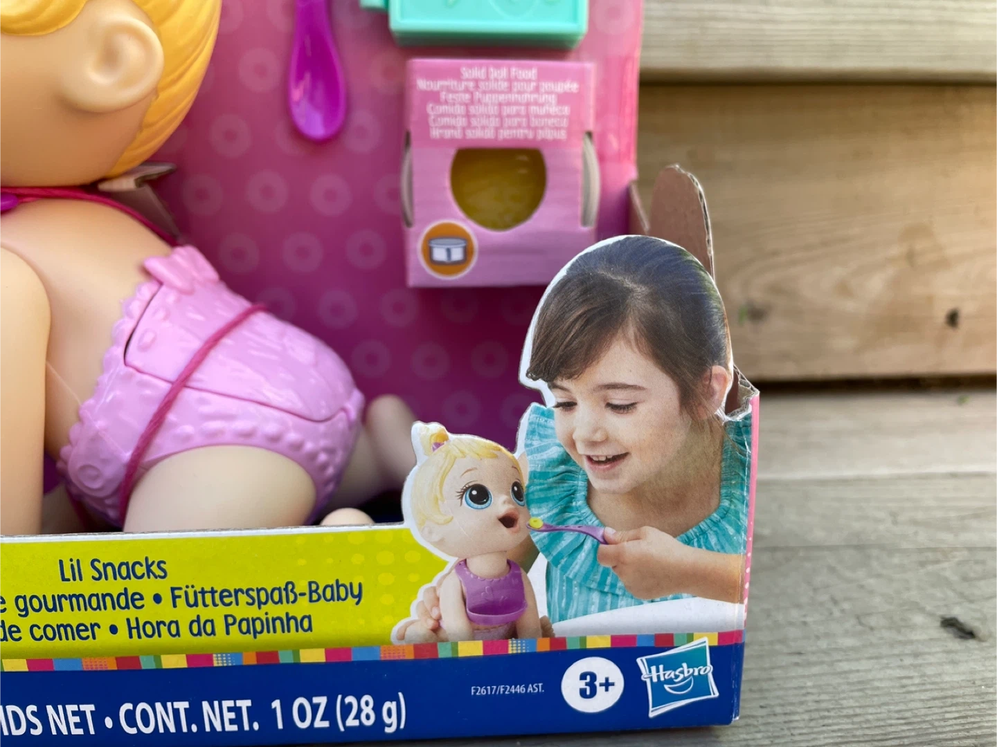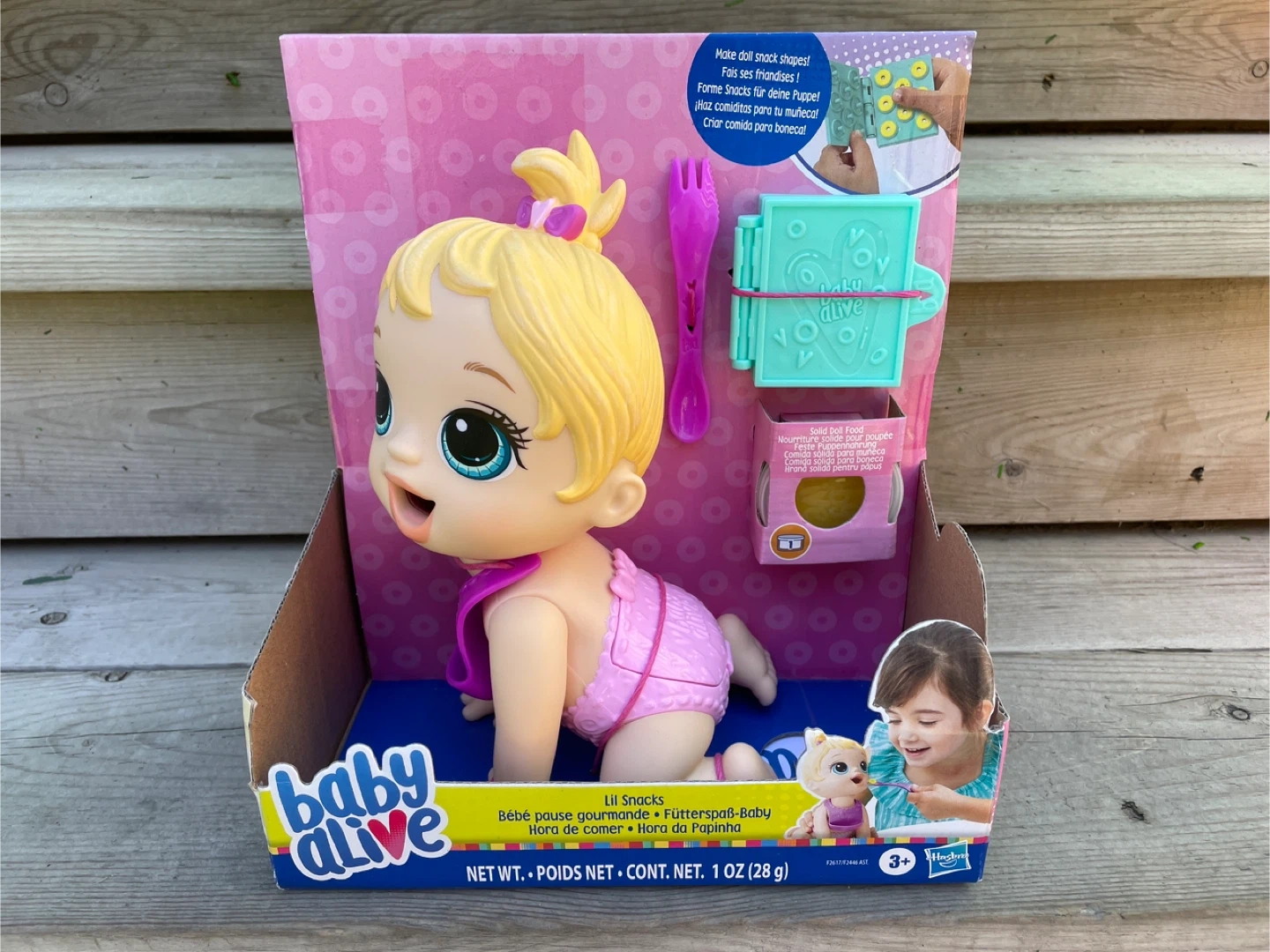 This Baby Alive doll comes with solid doll food and accessories for feeding play. It includes a container for the food and a spoon. This toy is suitable for ages 3 and up.