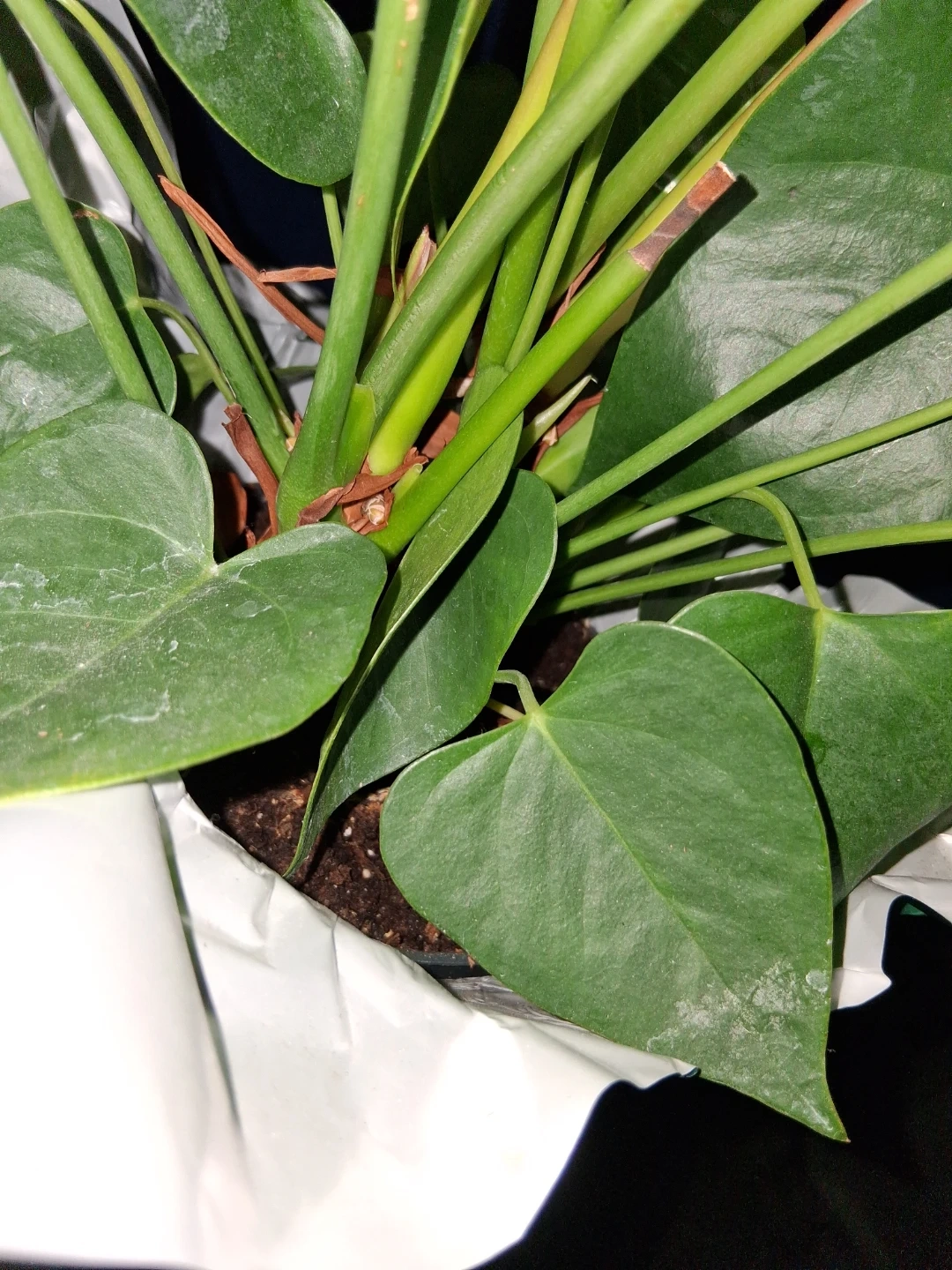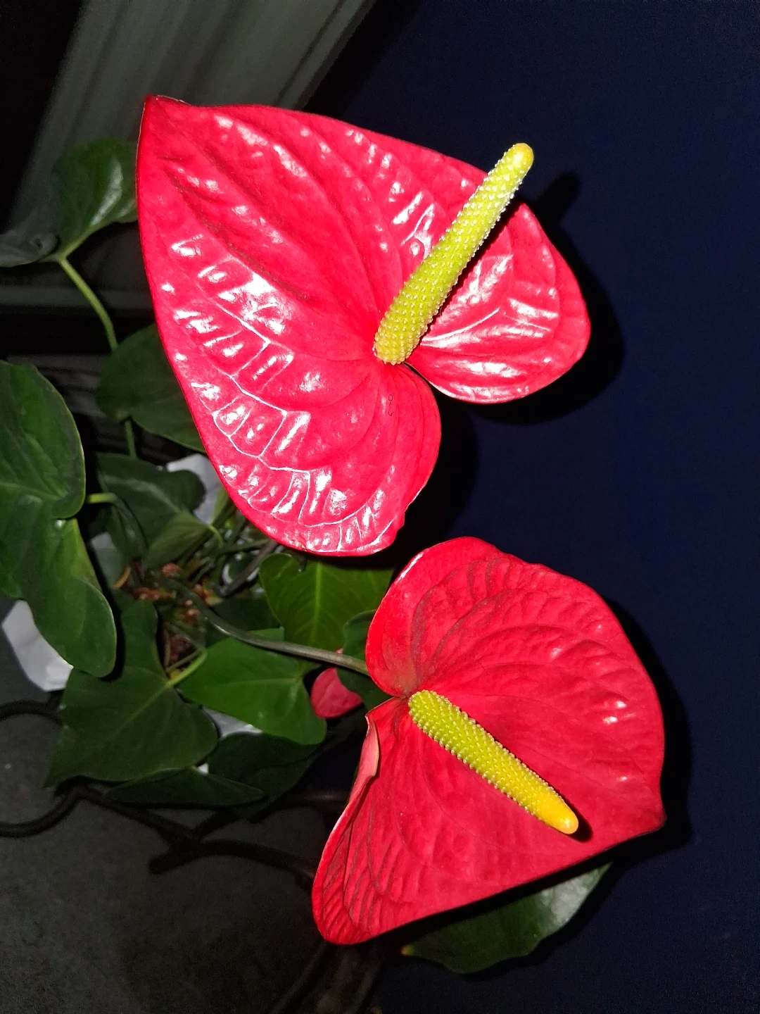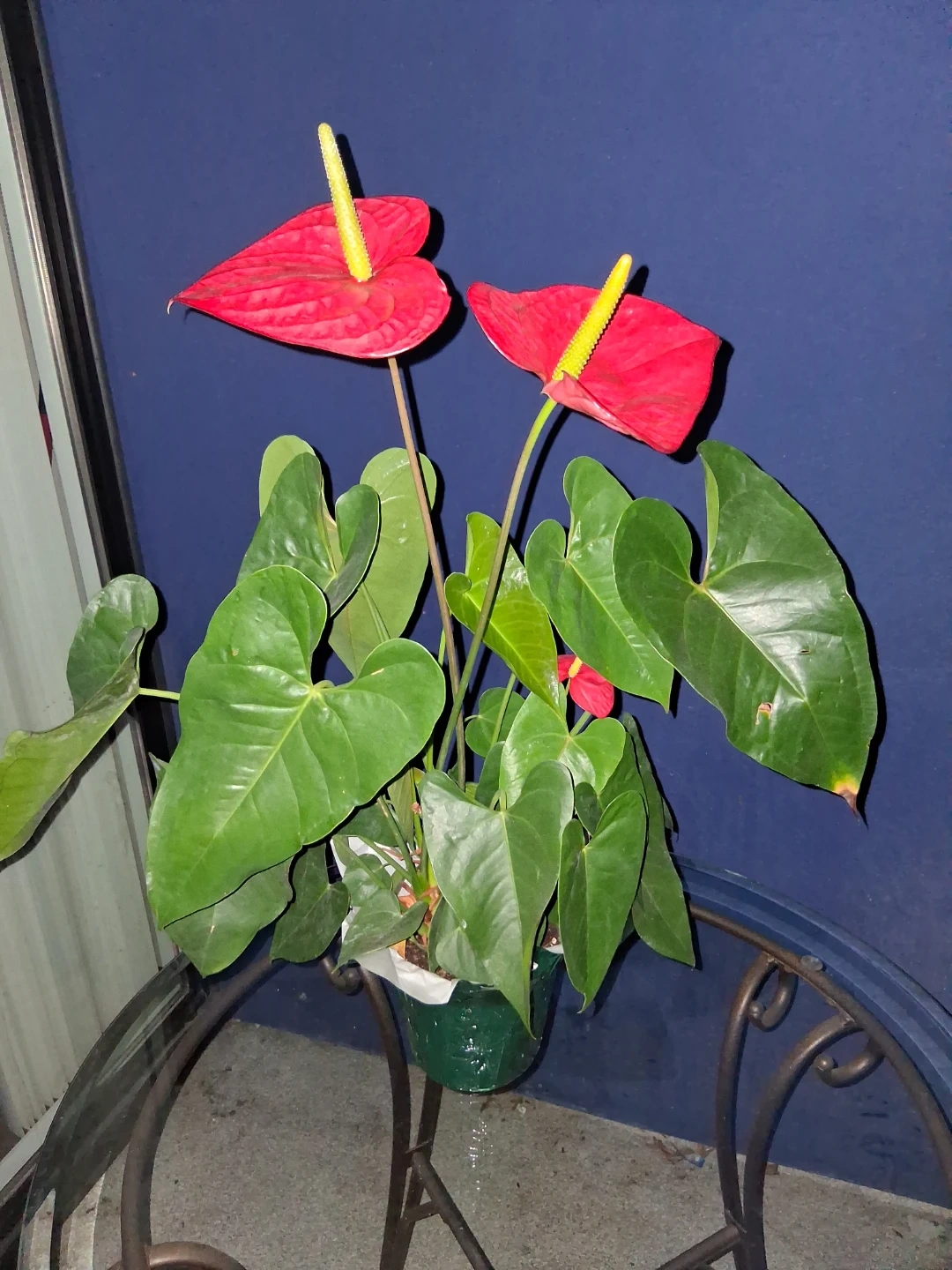 A healthy red Anthurium plant with vibrant waxy blooms and glossy green leaves. It's potted in a green decorative container. Ready for a new home. Thanks π