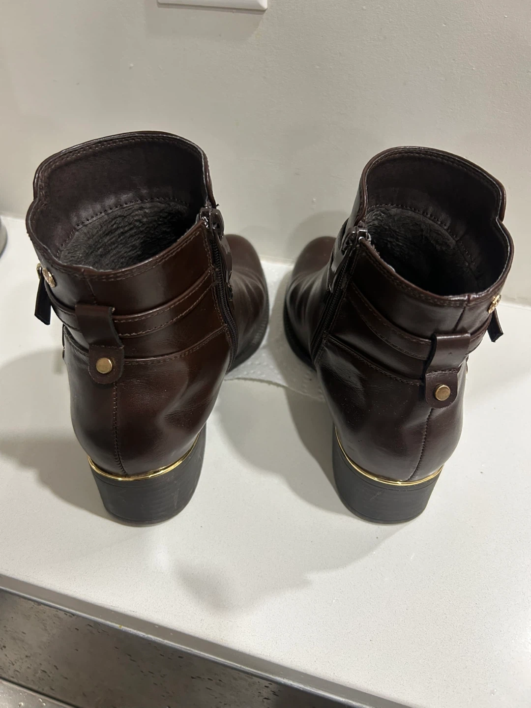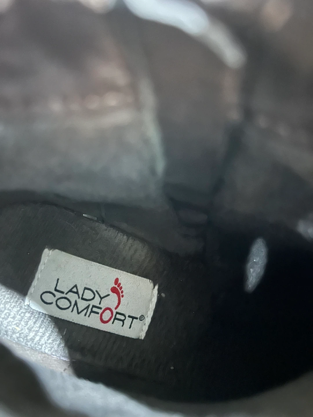 Selling a pair of Lady Comfort ankle boots in brown. They feature a zipper closure and a strap with a buckle detail. The heel has a gold accent.