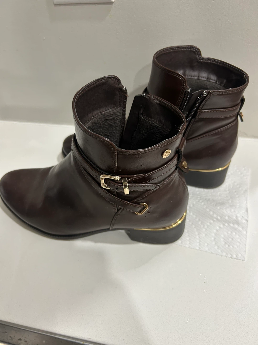 Selling a pair of Lady Comfort ankle boots in brown. They feature a zipper closure and a strap with a buckle detail. The heel has a gold accent.