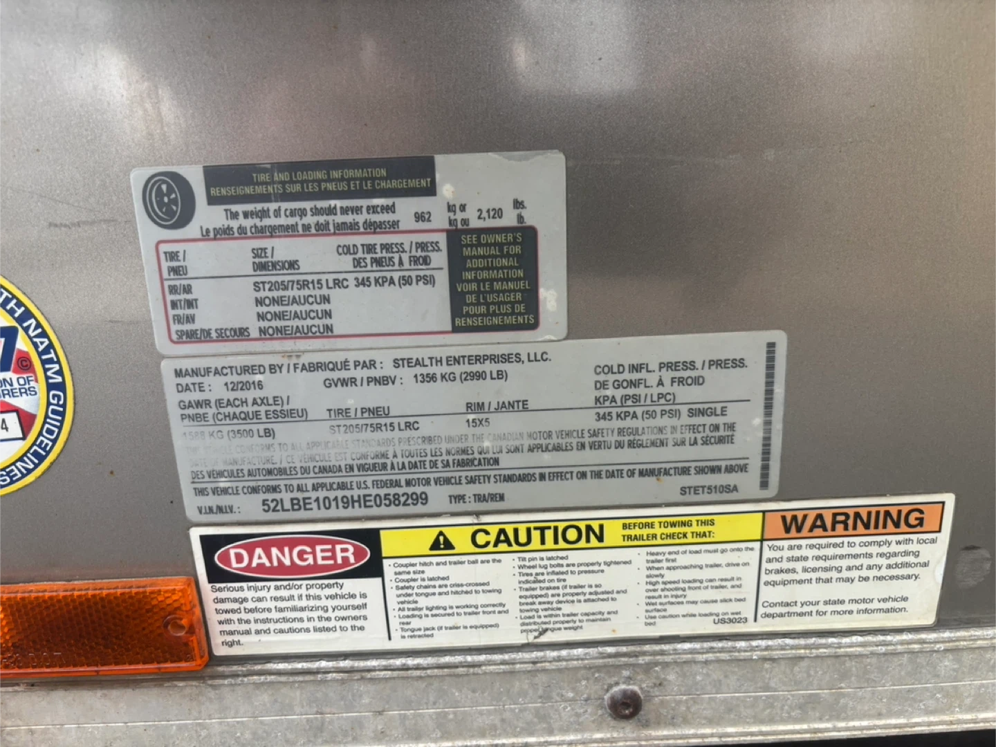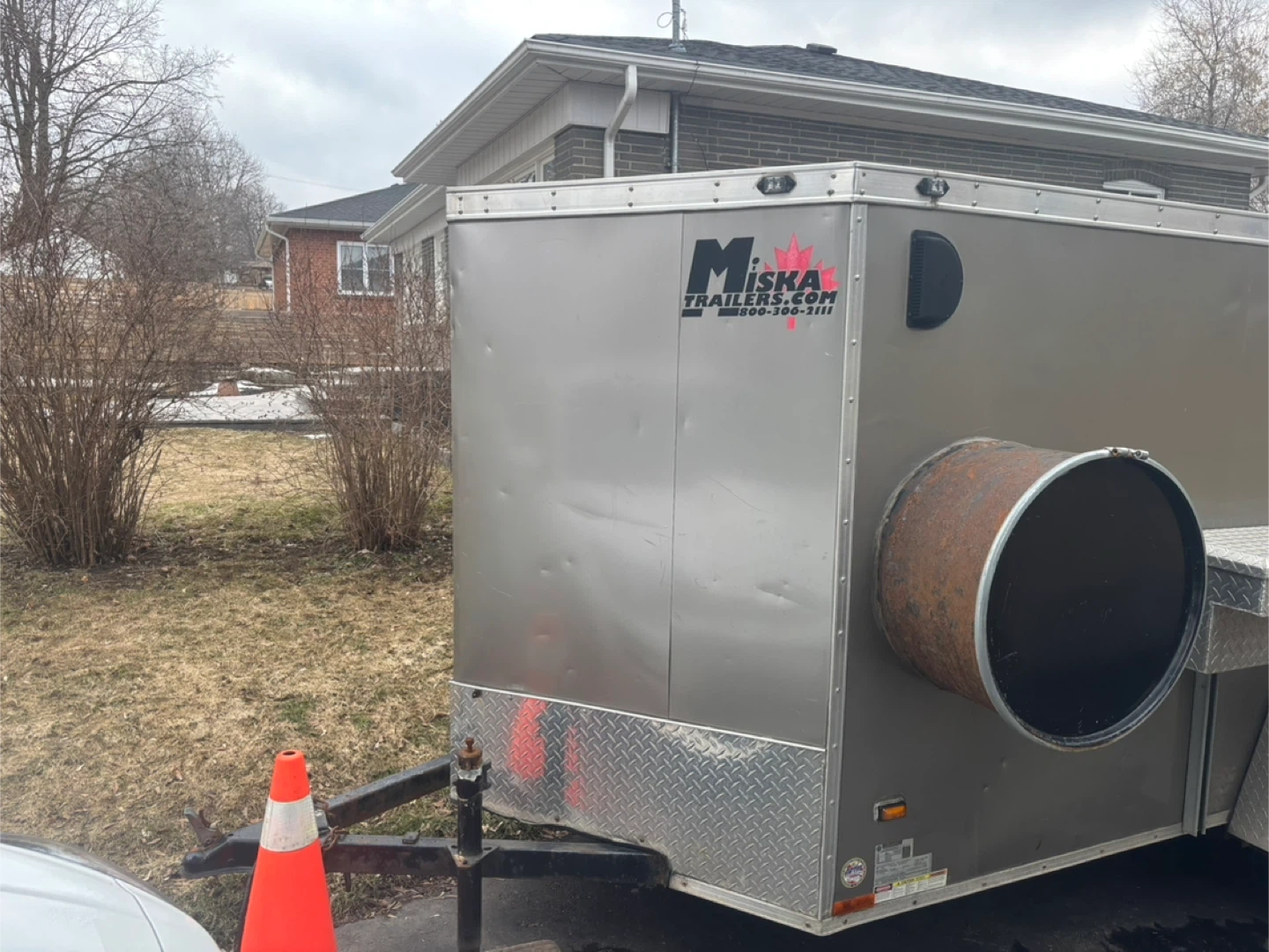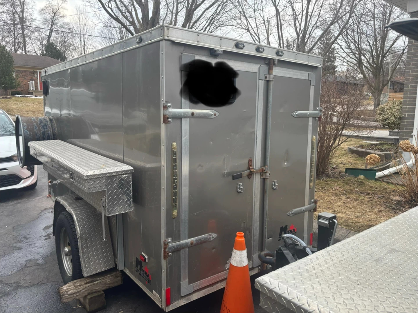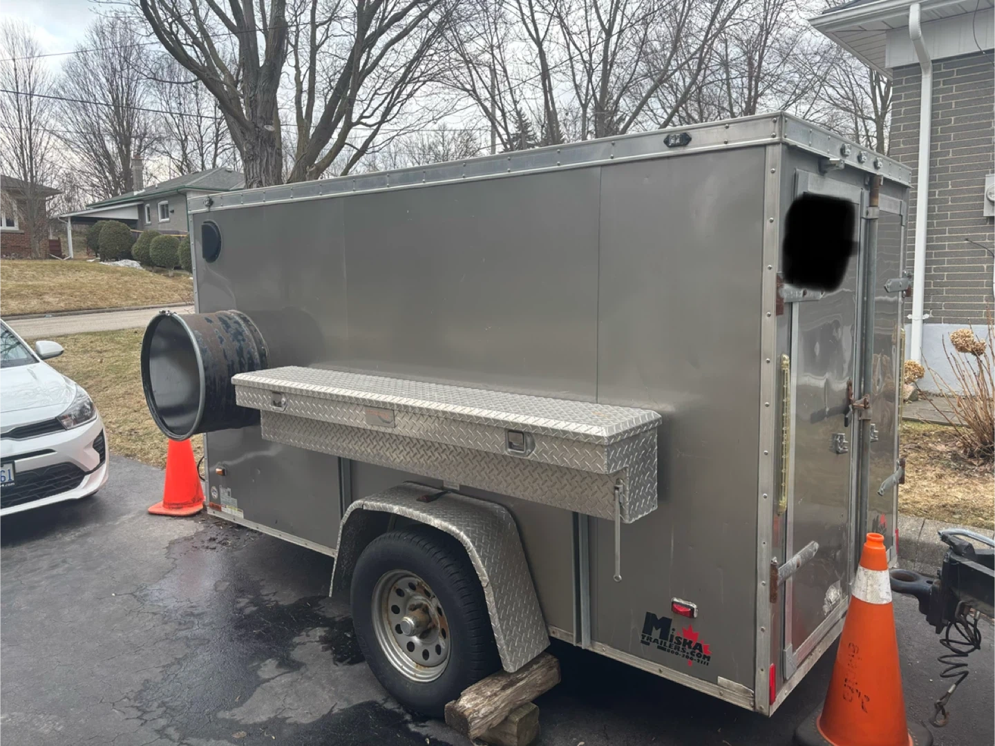 This is a grey enclosed cargo trailer manufactured by Miska Trailers. It has a GVWR of 1356 kg and a payload capacity of 962 kg. The trailer is equipped with a diamond plate toolbox mounted on the side.
