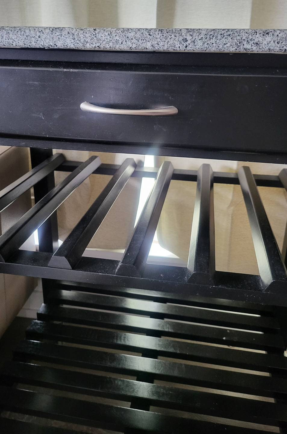 Rolling kitchen cart. Features granite countertop, one drawer, and two shelves. Lower shelf has wine rack design. Black frame. Wheels for easy mobility.