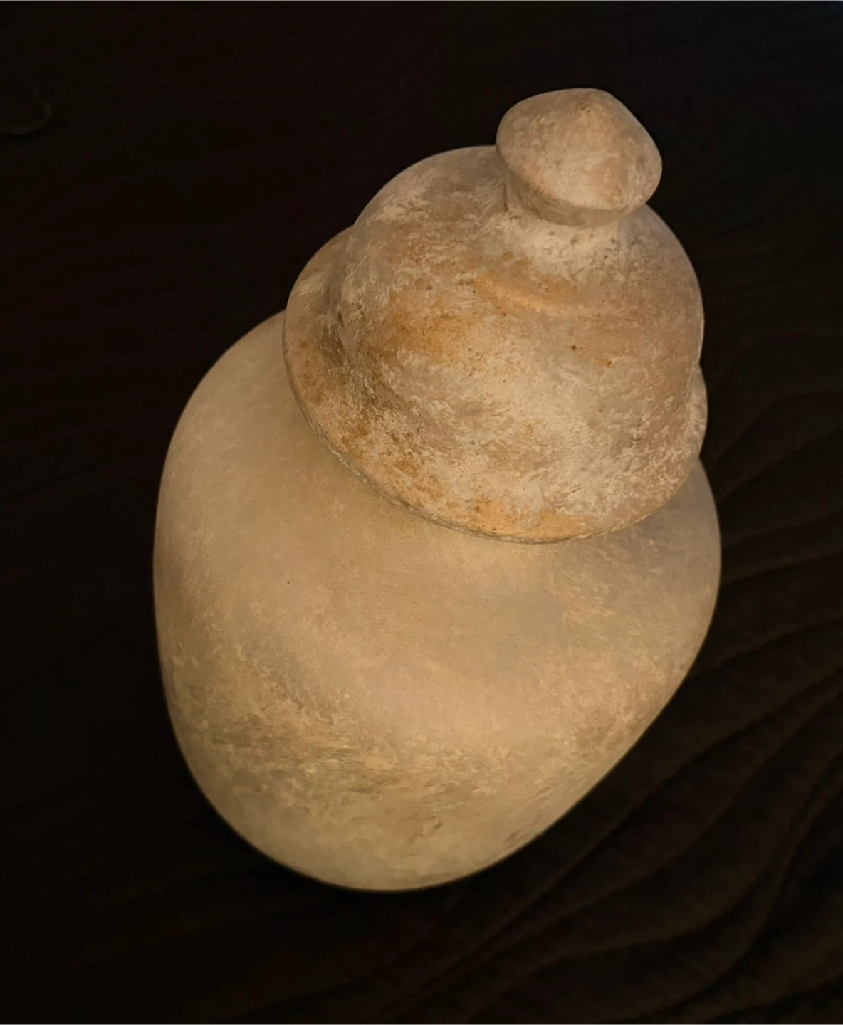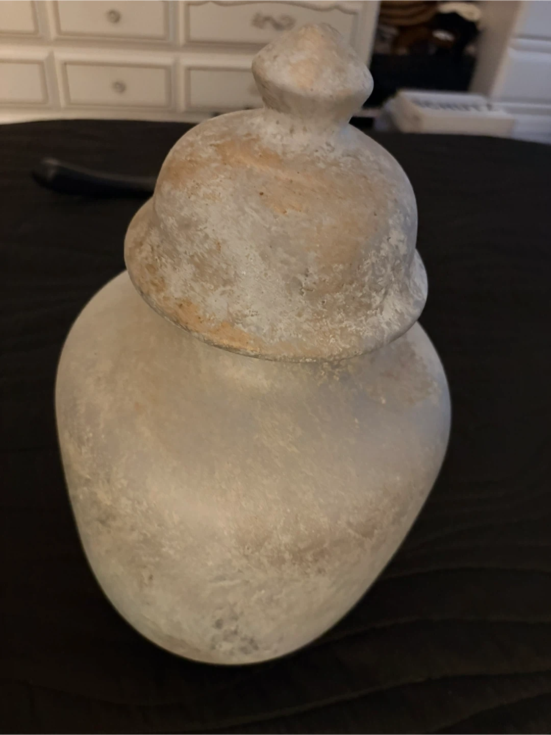 Selling a decorative stone jar with a lid. It's in great condition and would look lovely in any room. It has a rustic, earthy feel to it!